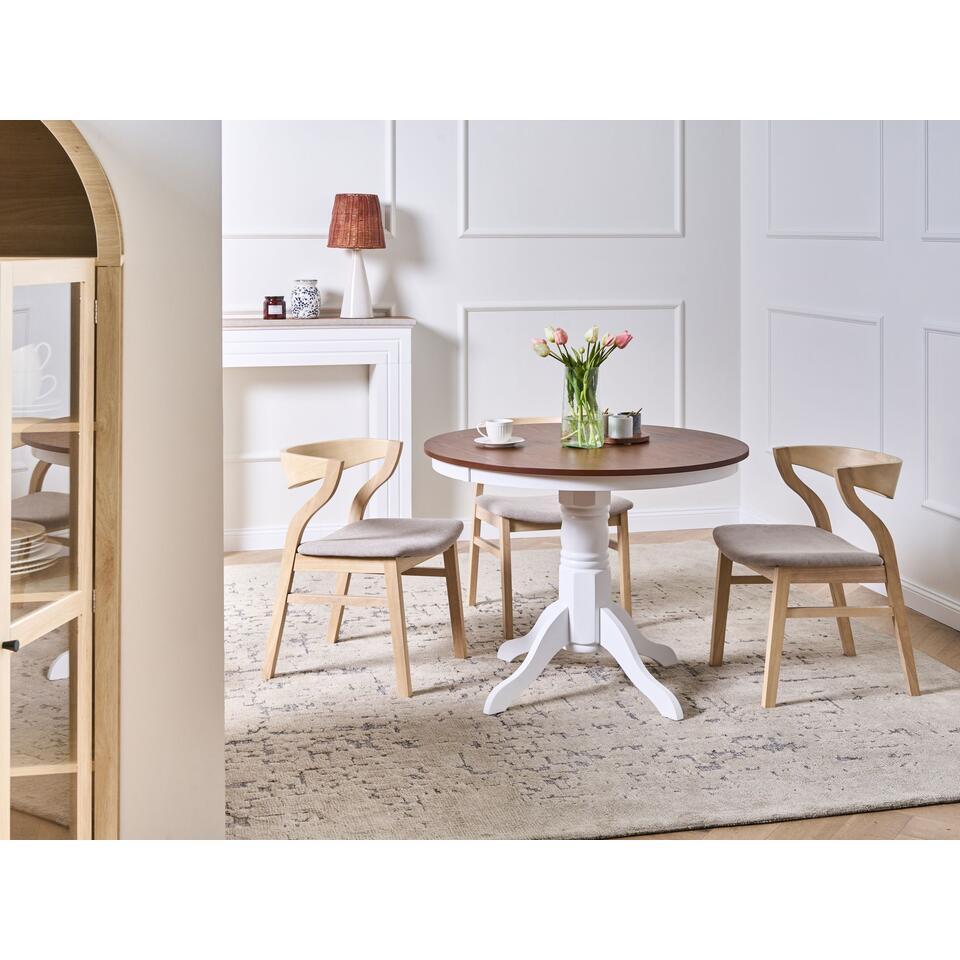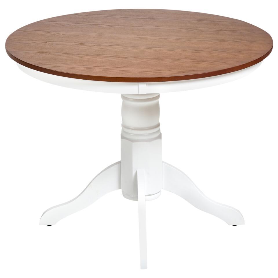 Eettafel in boerderijstijl. Breng een vleugje vintage charme naar je eethoek met deze prachtig vormgegeven tafel. Het retro-geïnspireerde voetstuk en de vier zacht gebogen poten, gemaakt van massief rubberhout in een witte afwerking, geven de tafel een lichte, uitnodigende uitstraling. Het ronde tafelblad, afgewerkt met bruin essenhoutfineer, biedt comfortabel plaats aan maximaal vier personen - perfect voor alles van ontspannen ontbijten tot gezellige diners. Dankzij het tijdloze ontwerp en de kwaliteitsconstructie blijft hij er jarenlang goed uitzien, wat je stijl ook is.