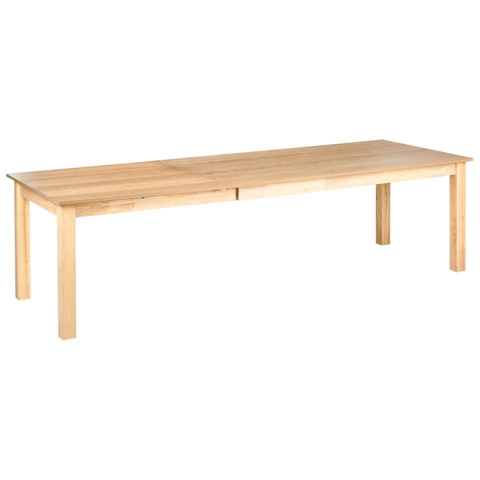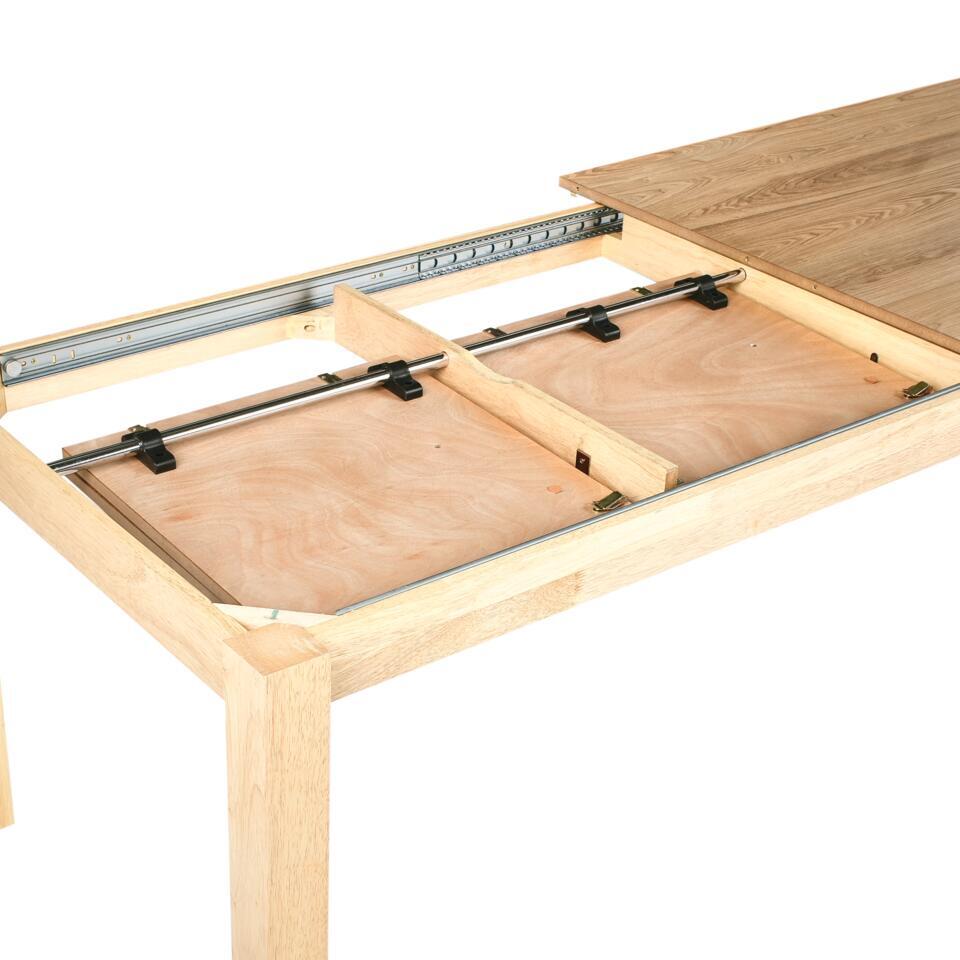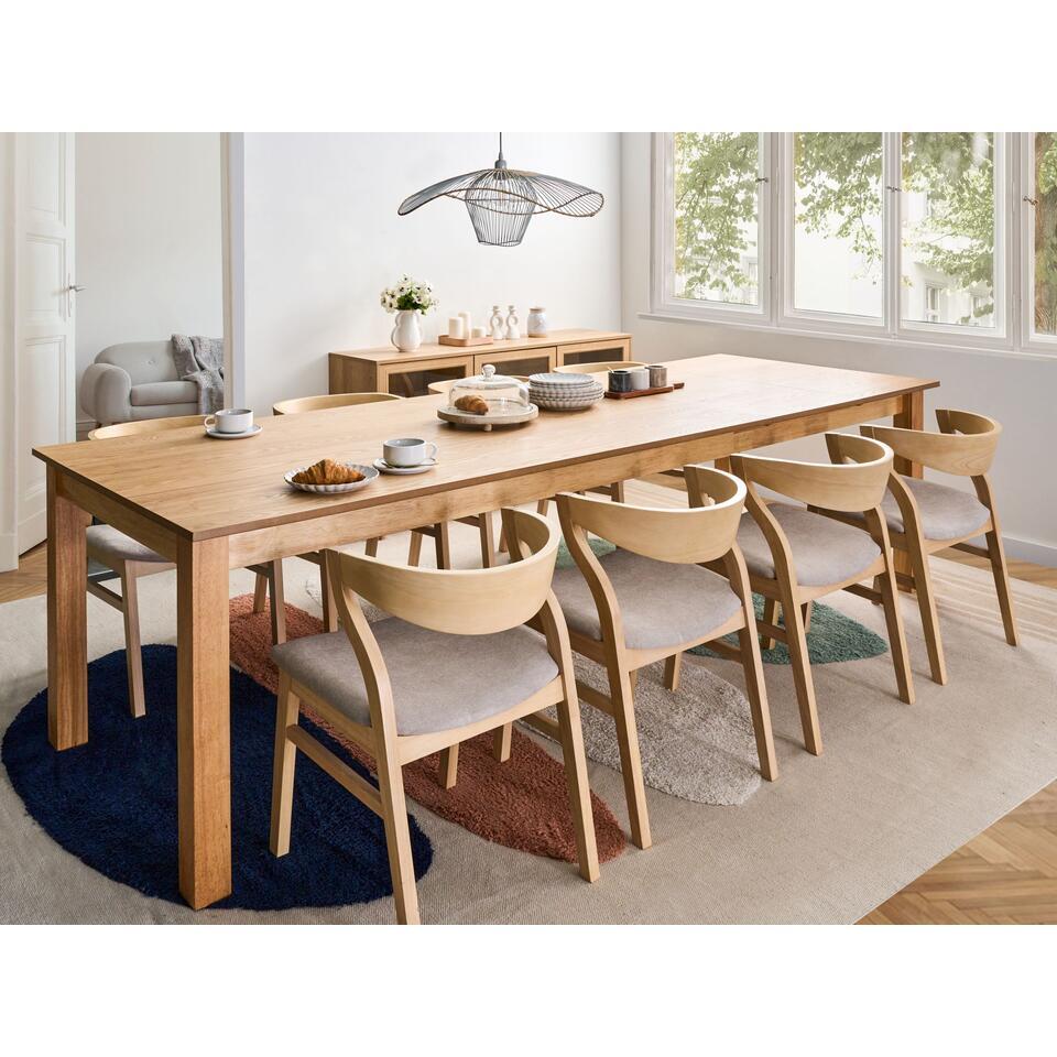 Uitschuifbare tafel met natuurlijke afwerking. Geniet van geweldige eetmogelijkheden met deze klassieke, traditionele uitschuifbare tafel, die plaats biedt aan maximaal 10 personen voor grote gezelschappen. De tafel is ontworpen met het oog op stabiliteit en duurzaamheid en zijn tijdloze uitstraling wordt geaccentueerd door de natuurlijke houtnerfafwerking op het tafelblad. Gemaakt met poten van natuurlijk rubberhout, combineert deze tafel een elegante look met functionaliteit, waardoor je verzekerd bent van een betrouwbaar en elegant middelpunt voor je eetkamer.