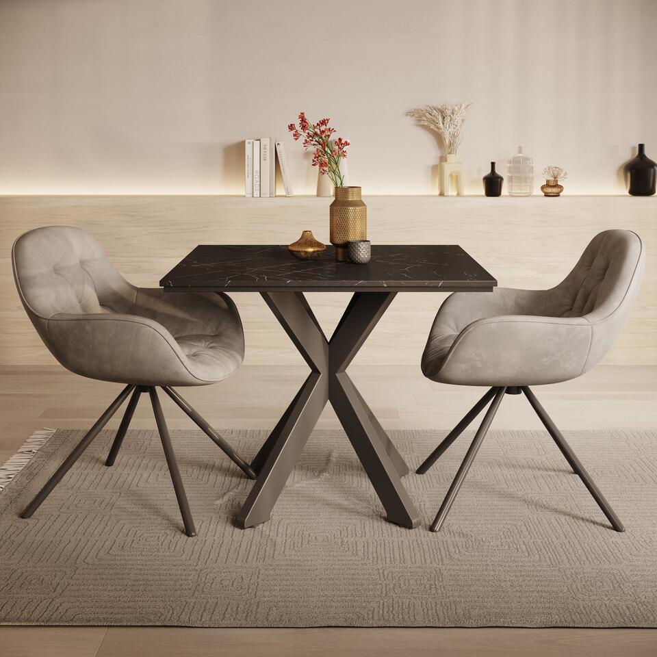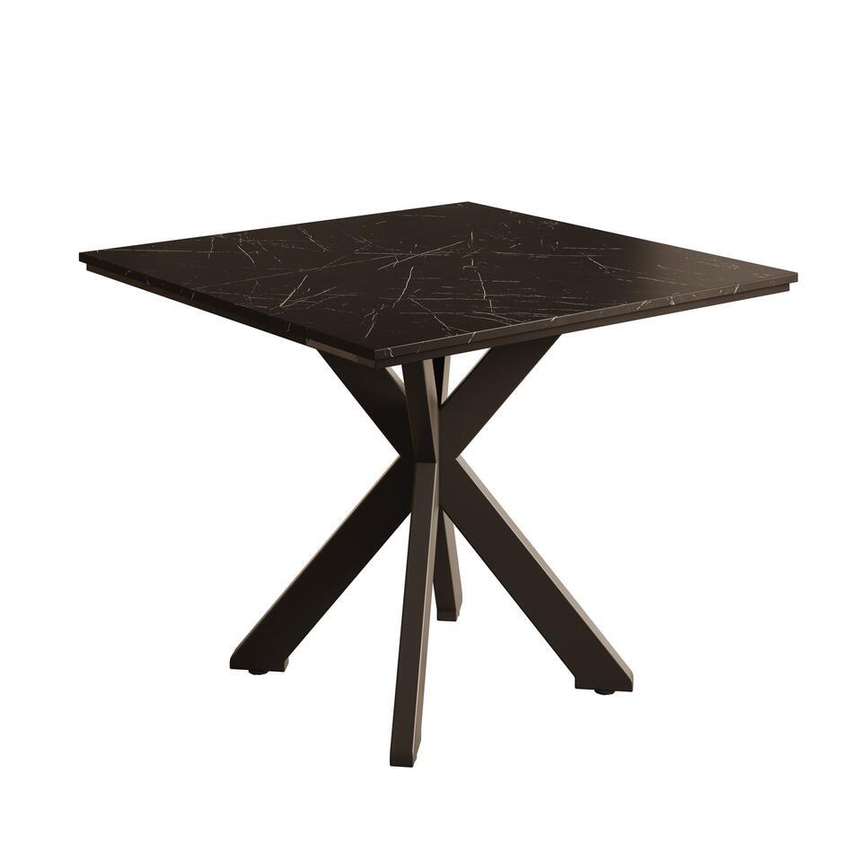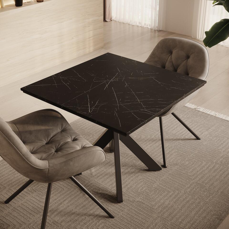 Eetkamertafel Pacey is een vierkante tafel in de kleur zwart marmerlook. De eettafel staat op zwarte X-poten die gemaakt zijn van metaal. Geschikt voor 2-4 personen. Het meubel heeft een moderne, industriële uitstraling. Het meubel wordt ongemonteerd geleverd. Je dient het dus met behulp van de bijgeleverde handleiding zelf in elkaar te zetten.