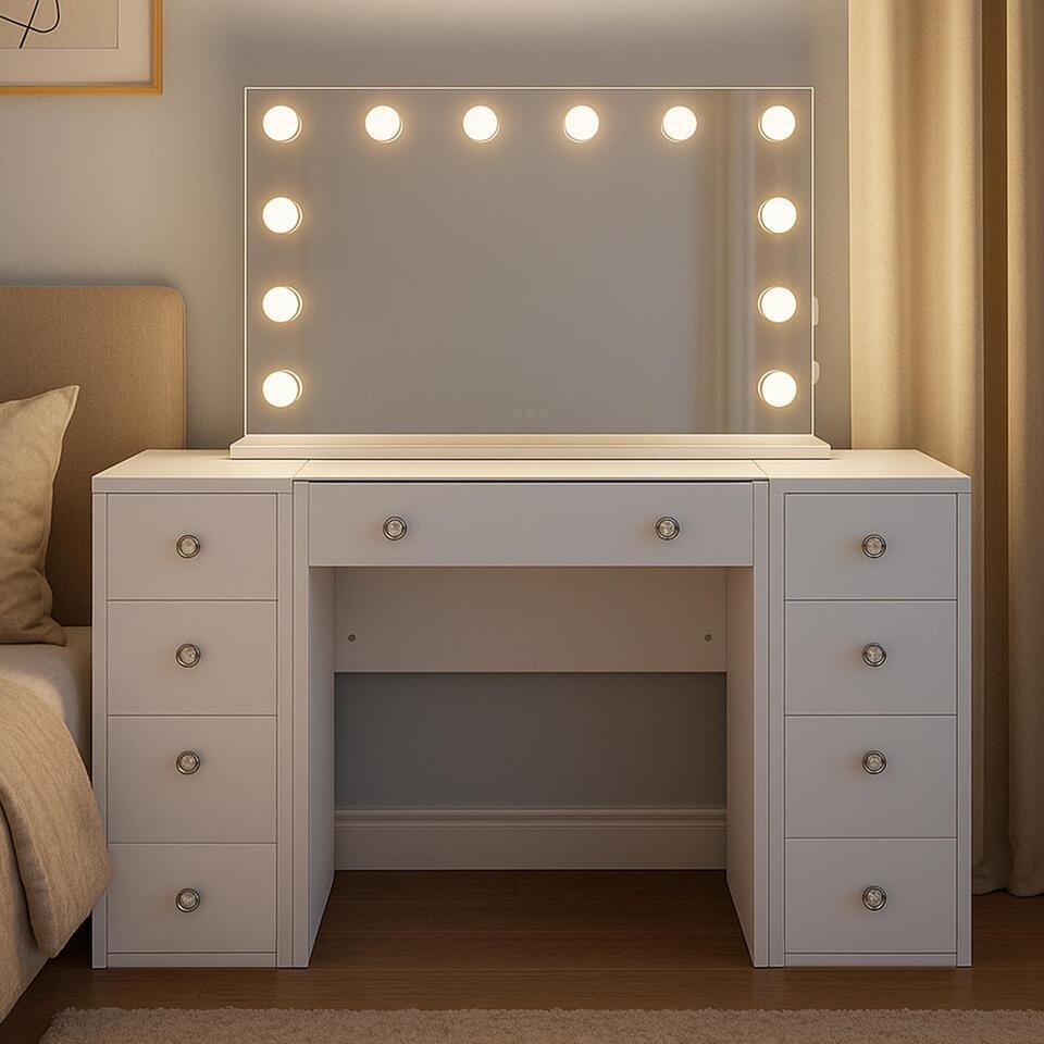 Uitgerust met een grote Hollywoodspiegel omlijst door twaalf energiebesparende LED-lampen, zorgt de make-uptafel voor de perfecte verlichting. De LED's kunnen worden ingesteld op drie verschillende lichtstanden (warm wit, neutraal wit en koel wit) en zijn dimbaar zodat je de helderheid kunt aanpassen aan je individuele behoeften.