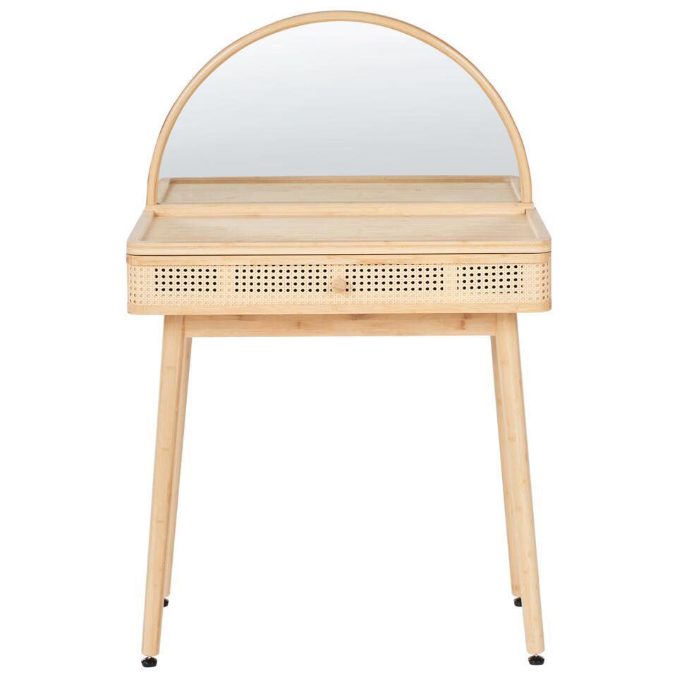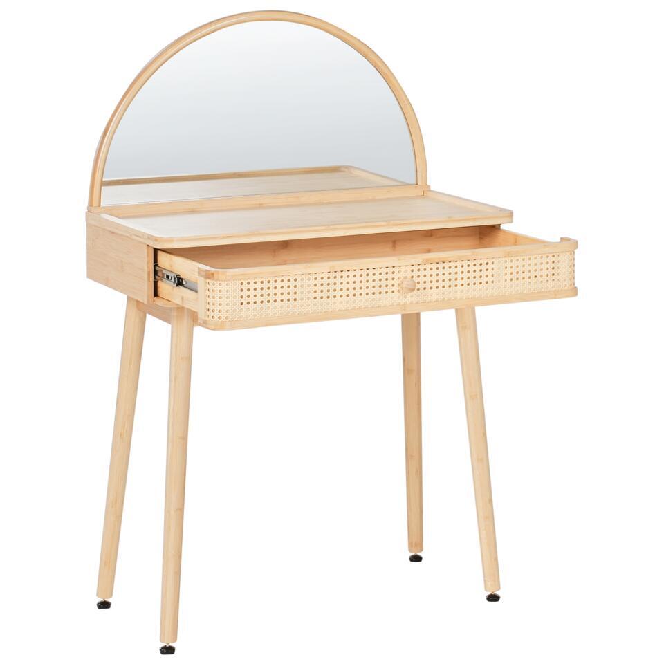 Stijlvolle boho kaptafel met Weense vlechtwerk. Deze kaptafel is gemaakt van natuurlijk bamboehout en geeft elke slaapkamer of kleedruimte warmte en charme. De elegante gebogen spiegel en de geweven ladefront geven een subtiele boho-touch, perfect voor zowel moderne als minimalistische interieurs. De ingebouwde lade biedt praktische opbergruimte voor cosmetica, borstels en accessoires.