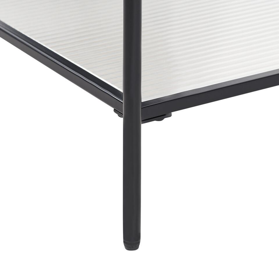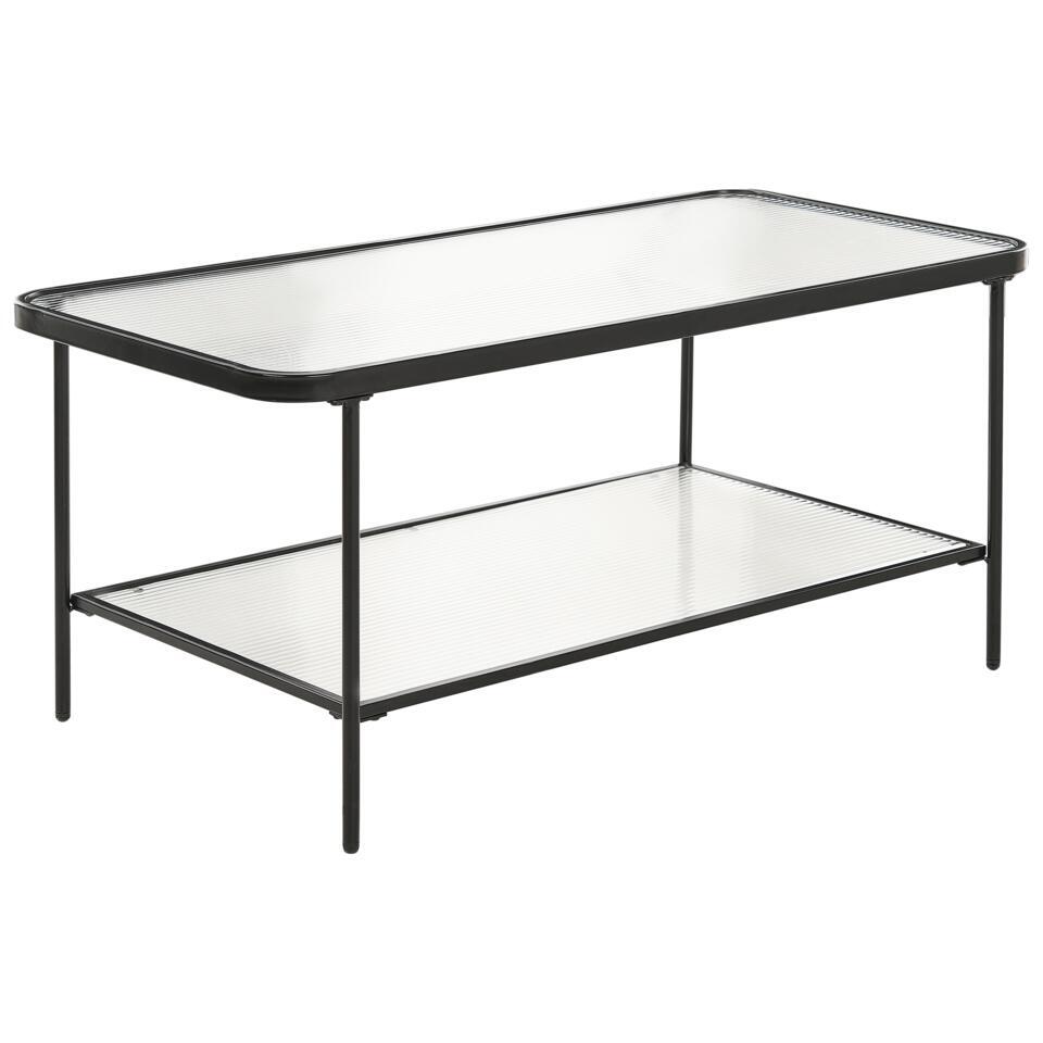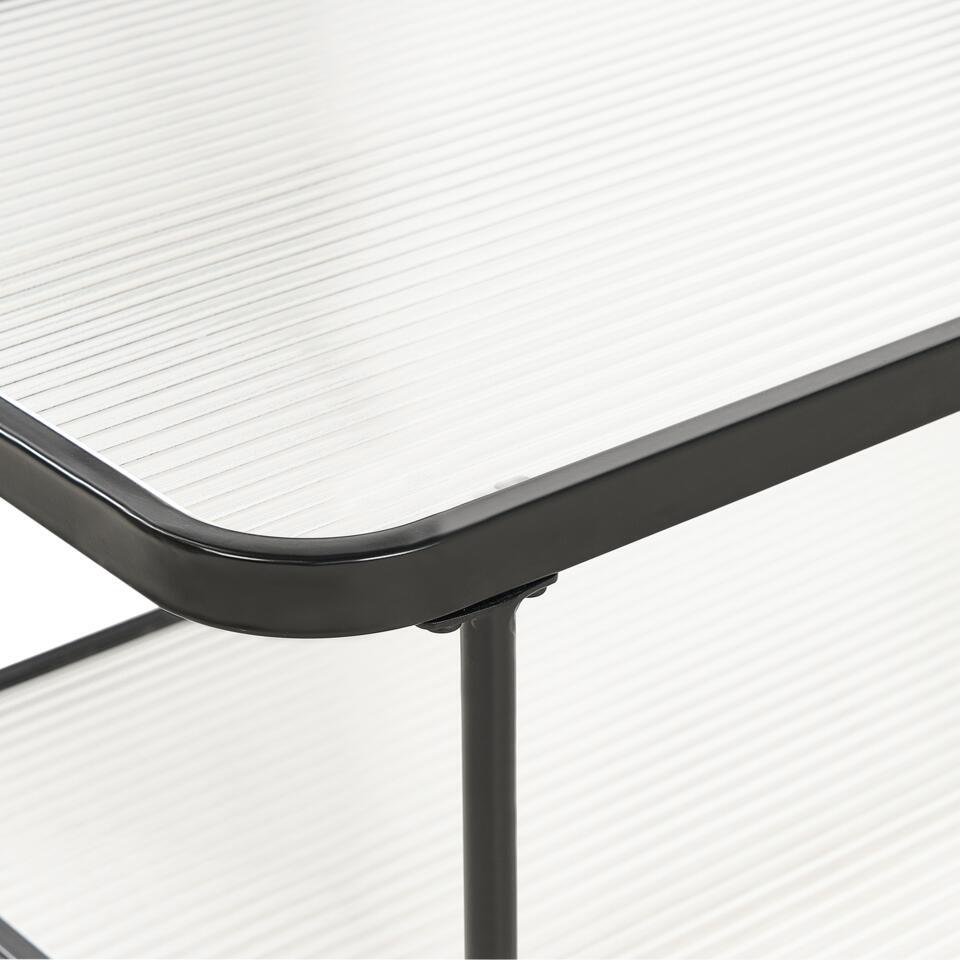 Rechthoekige retro salontafel met plank. Breng een vleugje retro elegantie in je woonruimte met deze vintage-geïnspireerde salontafel. Het blad van gehard, geribbeld glas voegt textuur en charme toe en biedt een duurzaam oppervlak voor je benodigdheden. Het slanke metalen frame, gecombineerd met het klassieke ontwerp, zorgt ervoor dat dit stuk een stijlvol middelpunt wordt in elke kamer, waarbij functionaliteit wordt gecombineerd met tijdloze esthetiek.