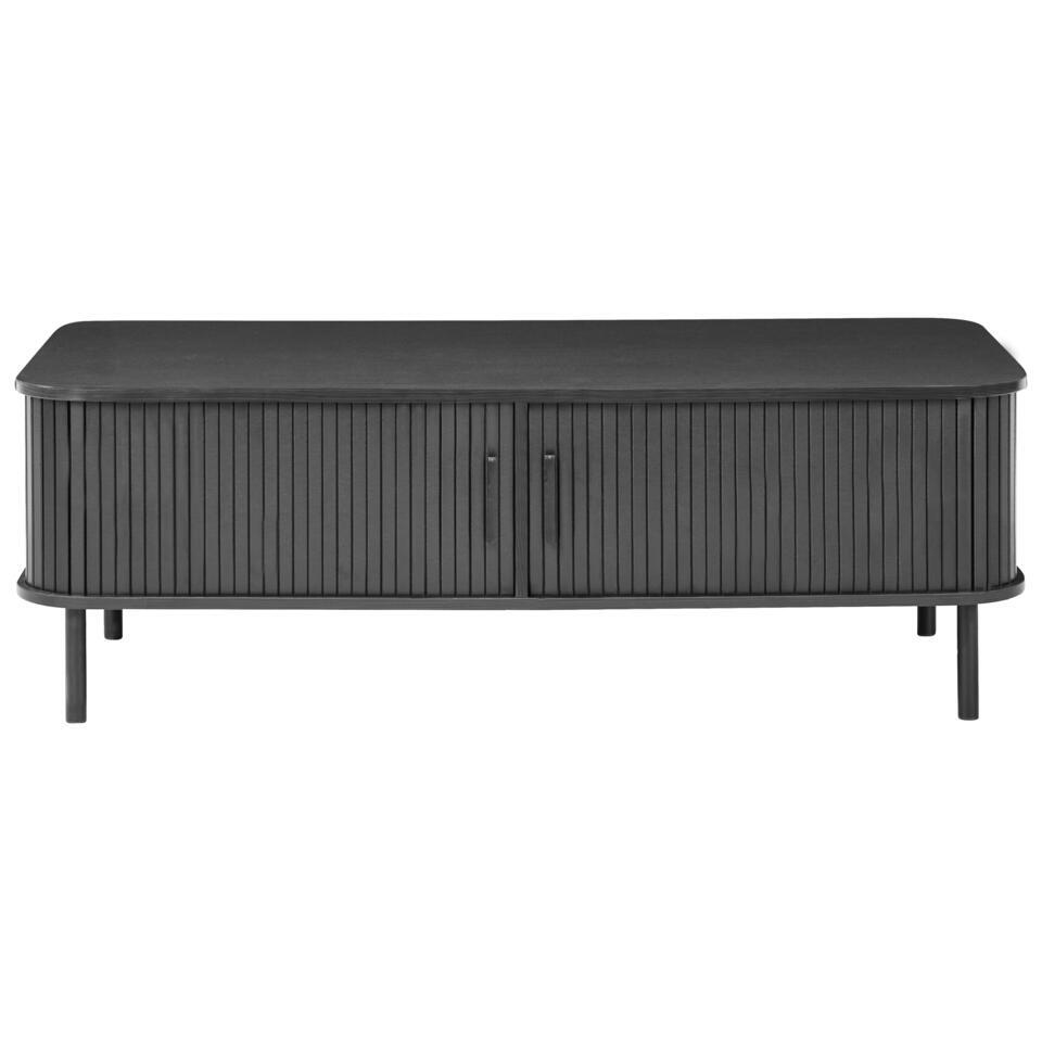 Retro salontafel met schuifdeuren. Richt je kamer in met deze salontafel en organiseer de kamer dankzij het ontwerp. Dit chique meubel heeft twee slanke schuifdeuren die ruime opbergruimte verbergen voor je boeken, kaarsen en andere benodigdheden voor de woonkamer, zodat je een rommelvrije omgeving hebt. Het retro design van het meubel, gecombineerd met de zwarte tint en zwarte poten, zorgen ervoor dat het opvalt en past bij verschillende interieurstijlen. Bovendien garanderen de hoogwaardige materialen die voor de constructie zijn gebruikt niet alleen eenvoudig onderhoud, maar ook duurzaamheid, waardoor het een praktische en stijlvolle toevoeging aan je huis is.
