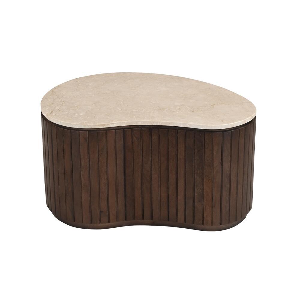 Laat je interieur tot leven komen met de bijzondere vormen van salontafelset Sorai. Deze set bestaat uit twee tafels met een elegant golvend silhouet, geïnspireerd op de vormen uit de natuur. Het warme houten onderstel met verfijnde latstructuur en het zachte natuurstenen blad vormen samen een stijlvol geheel dat rust én karakter uitstraalt.Dankzij de speelse asymmetrie en het praktische bij elkaar schuiven is deze set niet alleen mooi om te zien, maar ook functioneel in gebruik.