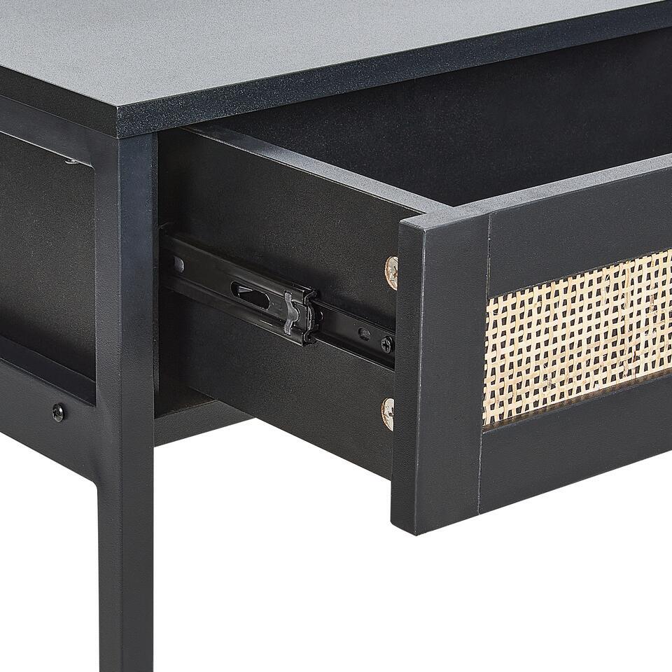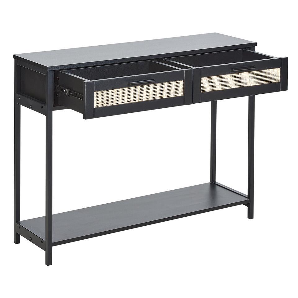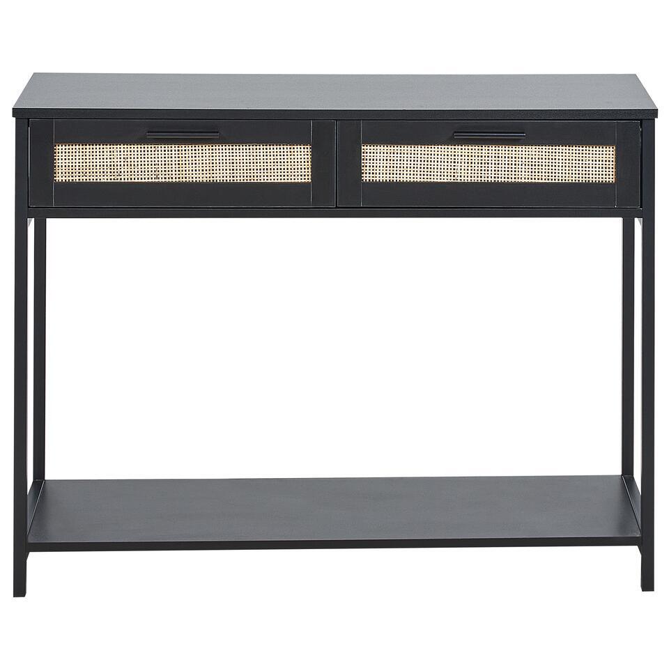 Console tafel met rotan frontjes. Deze consoletafel is een perfecte aanvulling voor elke ruimte, of het nu een woonkamer, slaapkamer of hal is. Met zijn twee laden kan hij dienen als opbergruimte voor sleutels en kleine accessoires, documenten, juwelen enz. Ondersteund door stevige rubberhouten poten, versierd met rotan vlechtwerk en afgewerkt met elegante, gouden handgrepen, combineert het meubel naadloos stijl en functionaliteit om elk interieur te verrijken.
