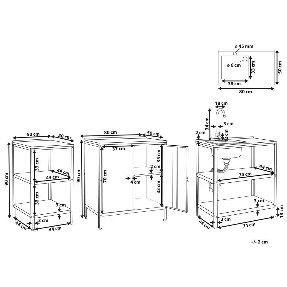 Buitenkeuken set. Een tuinkeukenset, ontworpen voor het grootste gemak, bestaat uit twee keukeneilanden, één voorzien van een gootsteen en één hendeluitloop, en een kast. Met open en kastplanken is het perfect voor het opbergen van voedsel en keukenaccessoires. Met deze set kun je bezig blijven met je gasten terwijl je buiten maaltijden bereidt, zodat je je niet steeds hoeft terug te trekken in je binnenkeuken. Het meubel is gemaakt van roestvrij staal met poedercoating en is volledig voorbereid op buitenomstandigheden, waardoor duurzaamheid gegarandeerd is. De praktische constructie omvat een gootsteen met een enkele mengkraan en een ruim tafelblad, perfect om ingrediënten voor te bereiden of te gebruiken als grillstation, zodat je kunt genieten van het plezier van buiten koken.