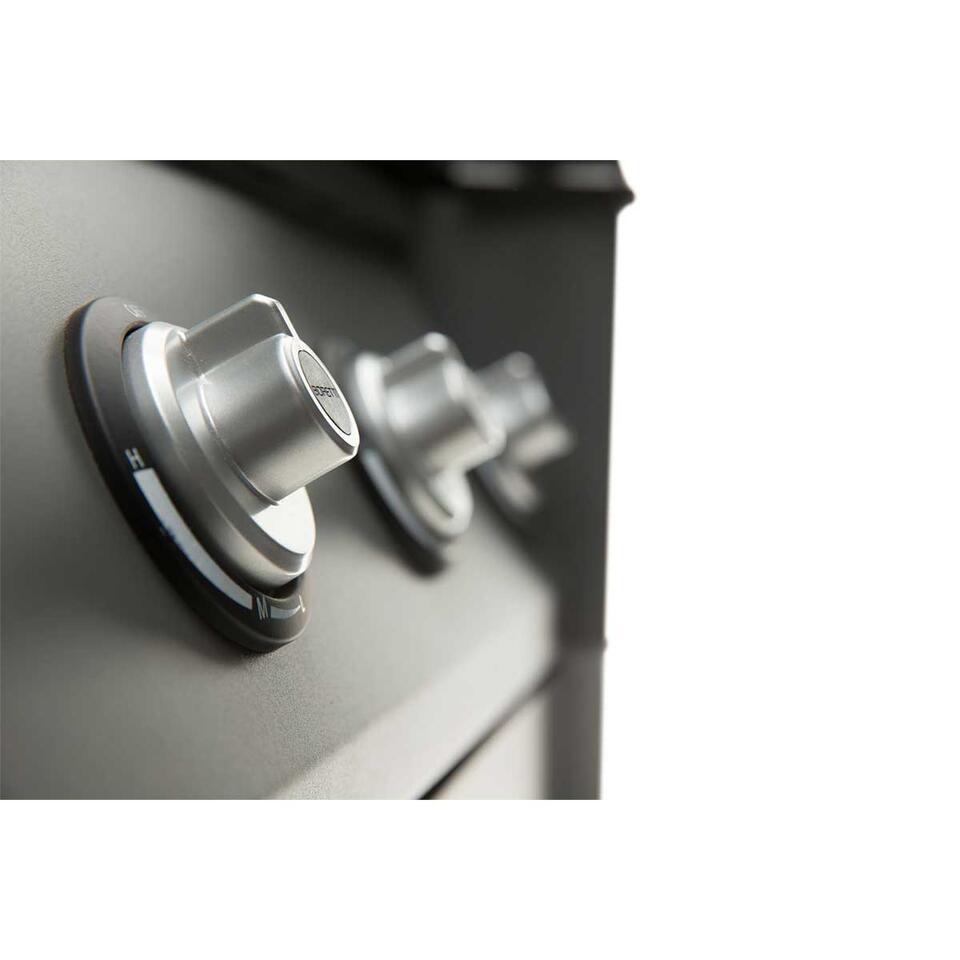 De afmeting barbecue: B 159 x D 64 H 120cm met een kookoppervlak: B 80 x D 48 cm. De barbecue heeft vier hoofdbranders van 4,6 kW/u per brander met een zijbrander van 3,0 kW/u. De branders hebben een elektronische ontsteking. De deksel is dubbelwandig met dekselthermom