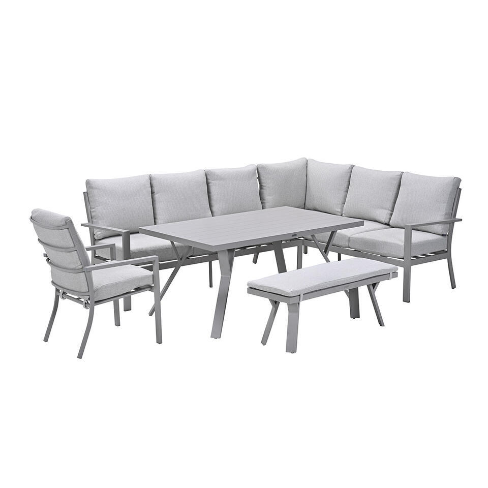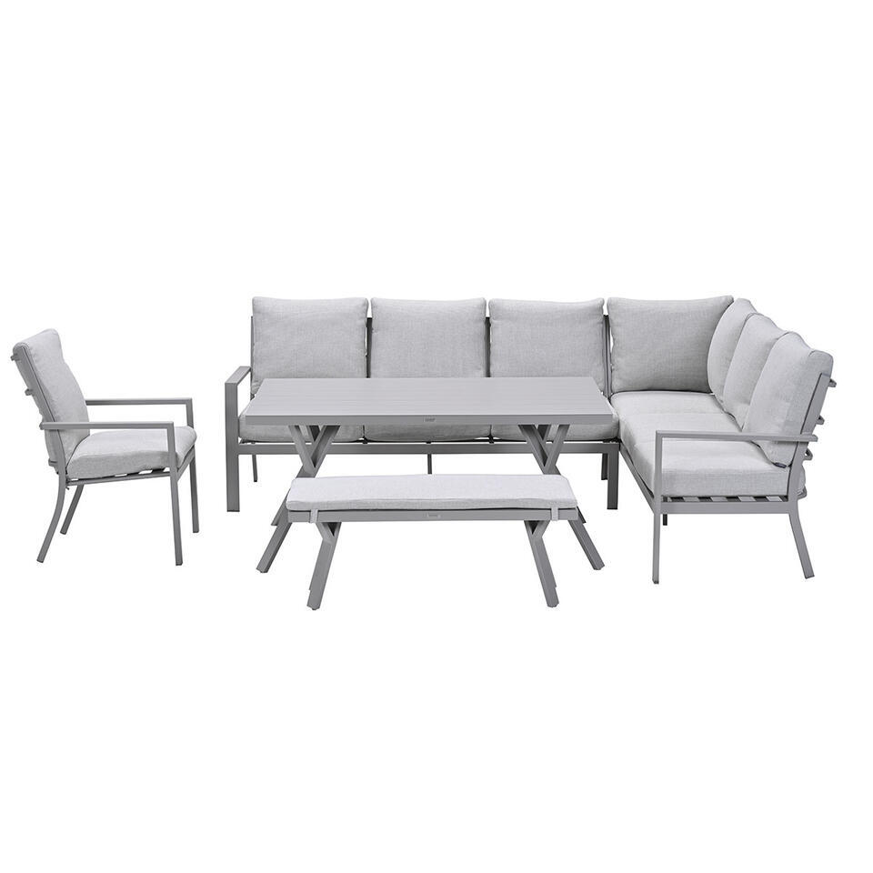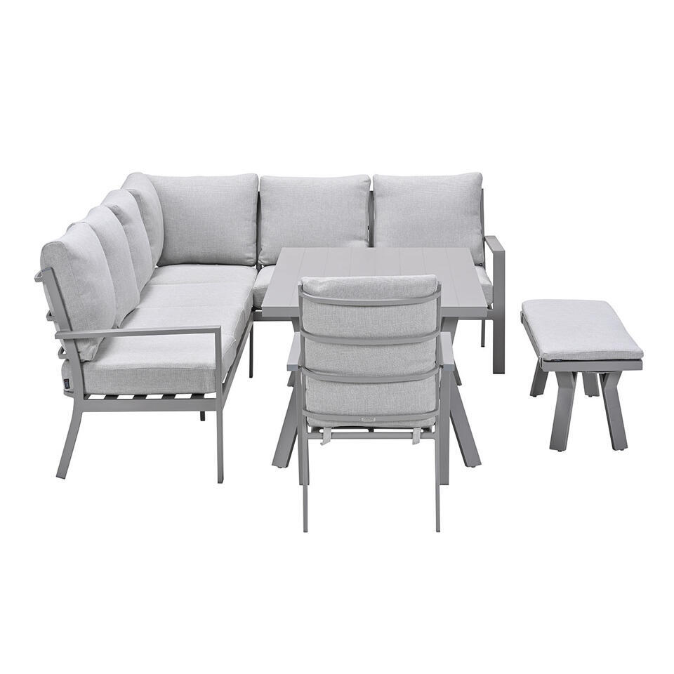 Afmeting lounge dining set: 262 x 201 x 85 cm, afmeting lounge tafel: 150 x 90 x 68 cm, Afmeting lounge dining stoel: 60 x 72,5 x 93, afmeting sportbank: 110 x 41 x 43 cm, aluminium lounge dining set rechts in taupe.