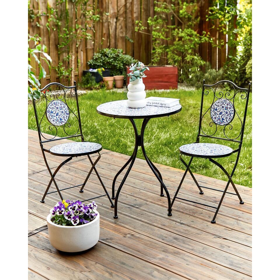 Vintage stijl klapstoelen met mozaïek patroon. Geef je balkon of terras vintage allure met deze charmante set klapstoelen. De stoelen zijn gemaakt van robuust metaal en verfraaid met een prachtig keramisch mozaïekpatroon, dat zowel duurzaamheid als elegantie biedt. Ze zijn ontworpen om de weersomstandigheden te weerstaan en zijn gemakkelijk te onderhouden, waardoor ze de perfecte keuze zijn voor een verfrissend drankje in de zomer of een gezellig gesprek met een vriend.
