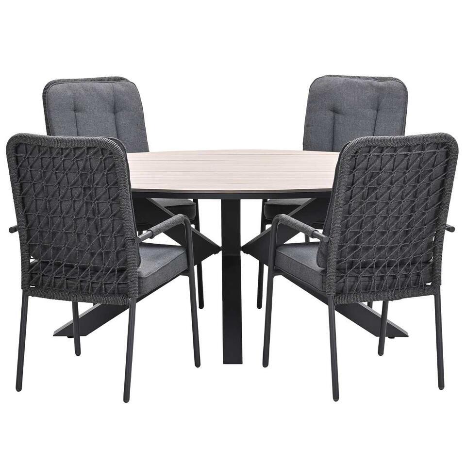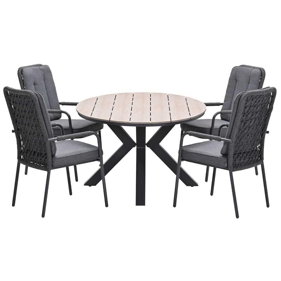 Deze prachtige tuinset bestaat uit een tuintafel met vironwood tafelblad en vier comfortabele tuinstoelen. De tuintafel heeft weinig onderhoud nodig en de tuinstoelen worden geleverd met waterafstotende kussens. Een heerlijke tuinset waar je in kunt dineren en ontspannen.