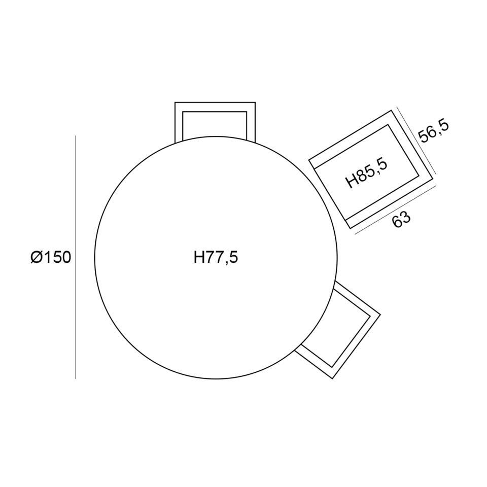 De tuinstoel heeft een afmeting van 56,5 bij 63 cm en is 85,5 cm hoog. De tuintafel heeft een doorsnede van 150 cm en een hoogte van 77,5 cm. Het tafelblad heeft een napoli sand.