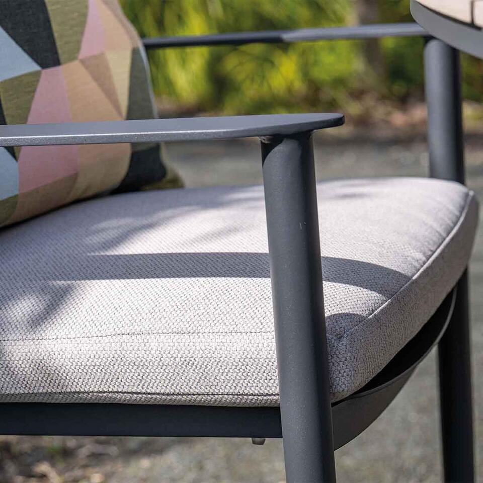 De Dane stapelbare tuinstoel heeft een frame dat gemaakt is van onderhoudsvrij en weerbestendig aluminium. Dit frame is voorzien van een stevige poedercoating. Het meegeleverde kussen is gemaakt van hoogwaardig kwaliteit polyester. Het zitkussen is voorzien van een rits waardoor de hoes gemakkelijk met de hand kan worden gewassen. Het kussen is niet waterbestendig en kan het beste na gebruik worden opgeborgen in de schuur of in een kussenbox. Wel is het kussen voorzien van een waterafstotende coating. Dit is vooral erg praktisch als er bijvoorbeeld op het kussen wordt gemorst met drinken, je veegt het vocht er namelijk gemakkelijk weer af.