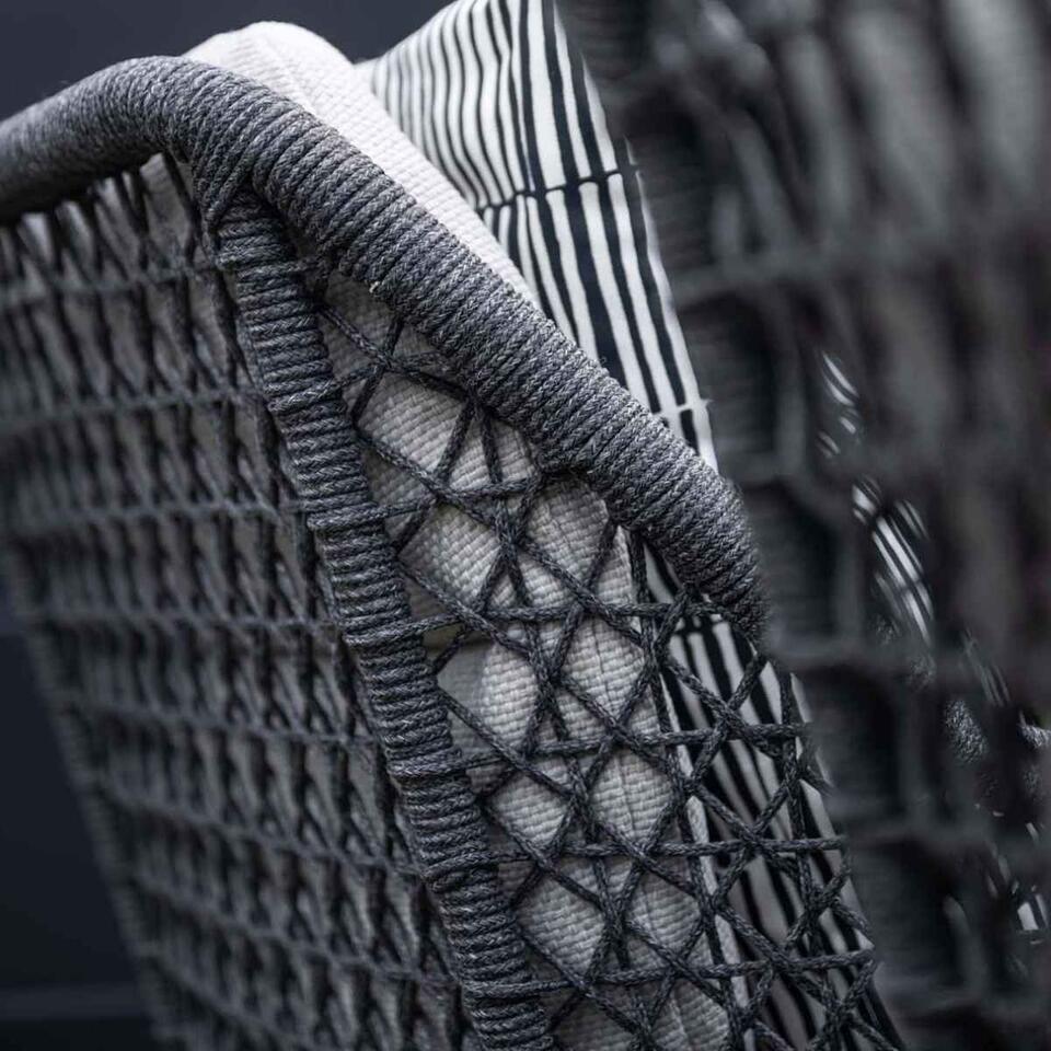 De Pemba tuinstoel is vervaardigd uit een onderhoudsvrij aluminium frame met een stevige poedercoating. Om dit aluminium frame zit hoogwaardige kwaliteit donker grijs gekleurd touw. Dit touw is te vergelijken met touw dat in de scheepsvaart gebruikt wordt. Het touw is voorzien van een rubberen kern binnenin met daarin meerdere polyester draden voor de stevigheid. Om de rubberen kern zit solution dyed polyester rope. Dit betekent dat het touw door en door gekleurd is en veel minder snel verkleurt.