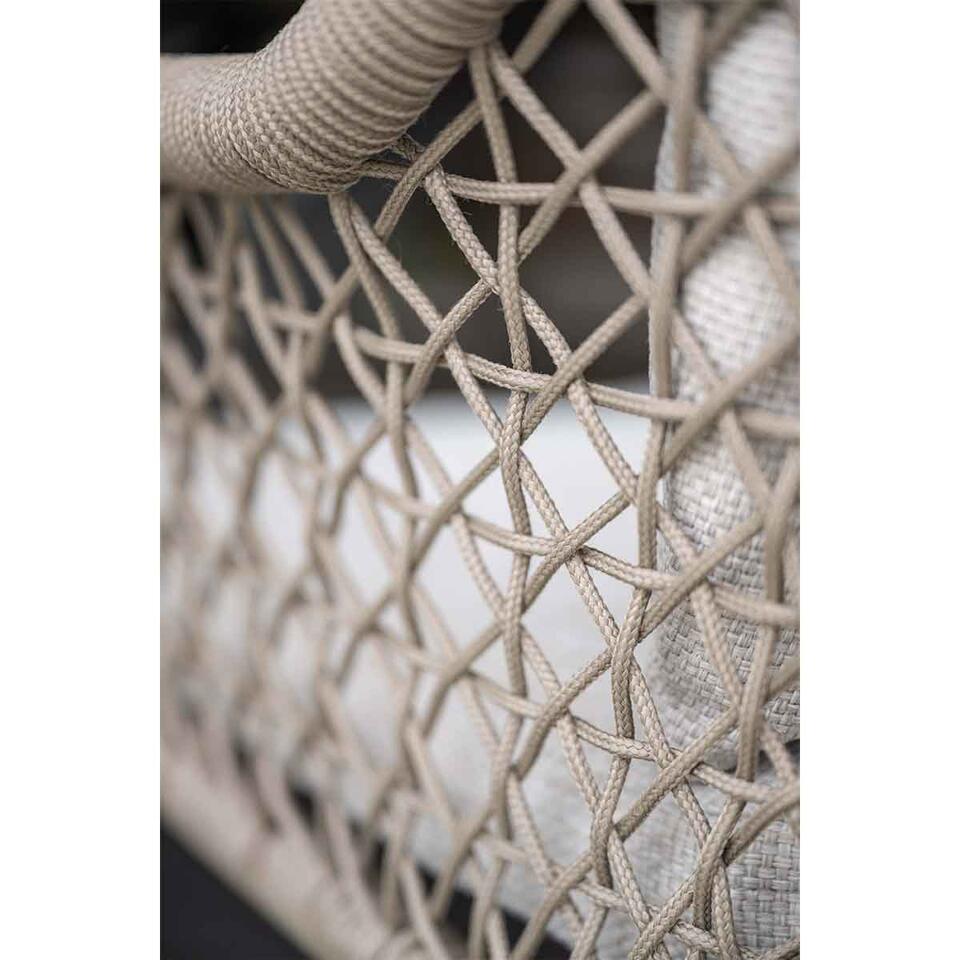 De Pemba tuinstoel heeft een frame dat gemaakt is van onderhoudsvrij aluminium. Dit frame is voorzien van stevige poedercoating. Om dit aluminium frame zit hoogwaardige kwaliteit donker grijs gekleurd touw. Dit touw is te vergelijken met touw dat in de scheepsvaart gebruikt wordt. Het touw is voorzien van een rubberen kern binnenin met daarin meerdere polyester draden voor de stevigheid. Om de rubberen kern zit solution dyed polyester rope. Dit betekent dat het touw door en door gekleurd is en veel minder snel verkleurt.