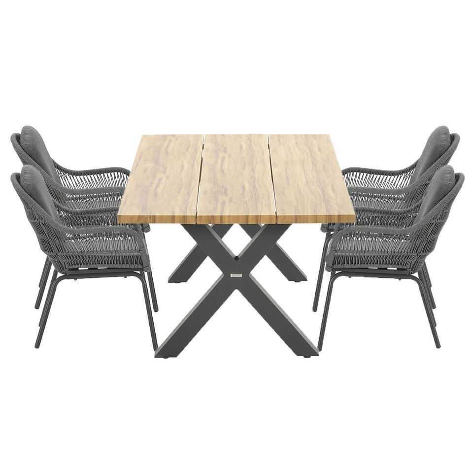 Het tafelblad heeft een afmeting van 180 cm en heeft een X-style tafelframe. Aluminium is schoon te maken met een sopje met groene zeep en lauw water. Voor het drogen kun je het beste een pluisvrije doek gebruiken. Aluminium kan vies zijn geworden door opspattend regenwater of gemorst drinken bijvoorbeeld. Dit is eenvoudig schoon te maken met een sopje en een zachte doek. Het solution dyed polyester touw is eenvoudig te reinigen met een zachte borstel en de cleaner voor touw van Garden Impressions. Als het touw goed is gereinigd met de cleaner dan afspoelen met voldoende water. Wanneer het touw weer droog is dan dient het weer behandelt te worden met een beschermer. De beschermer zorgt er weer voor dat jouw touw water afstotend is. Het is aan te raden om dit minimaal twee keer per seizoen te doen en vooral de tastbare delen. Na ontvangst dient de tuintafel nog gemonteerd te worden. De poten dienen nog aan het blad gemonteerd te worden. Dit is op een gemakkelijke manier zelf te doen door de bijgeleverde handleiding en montage benodigdheden.