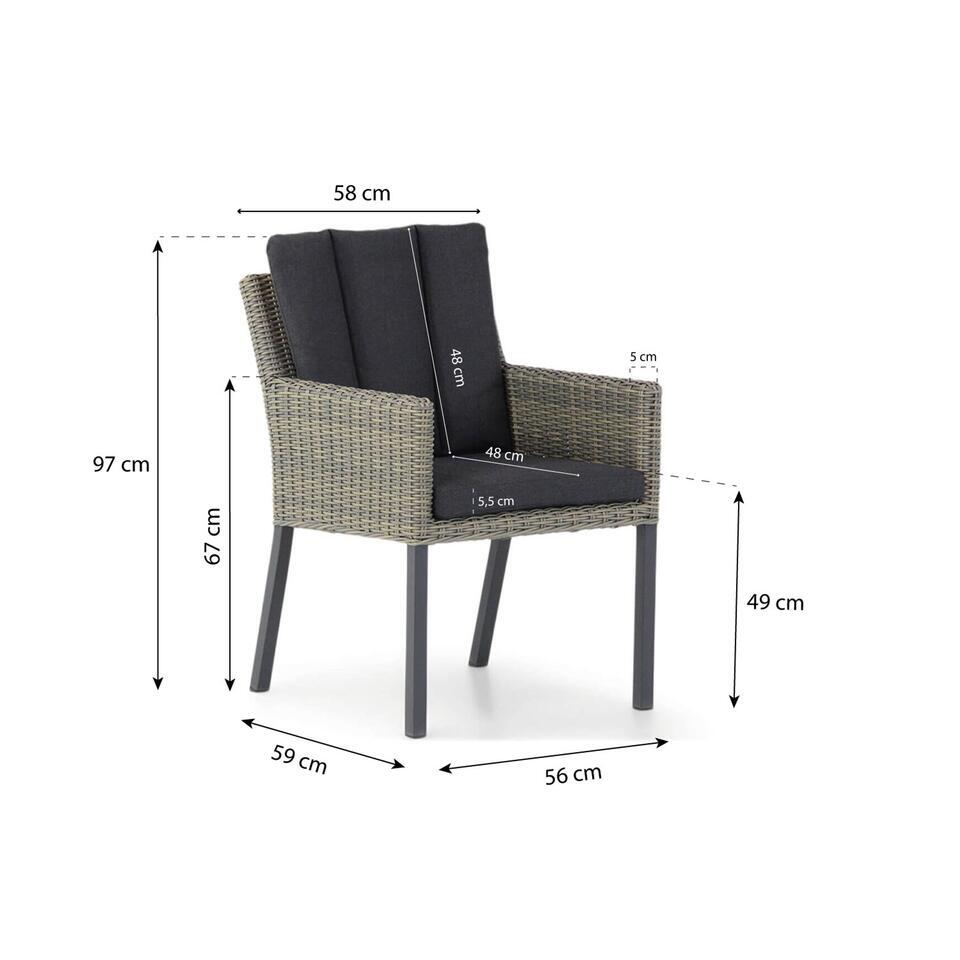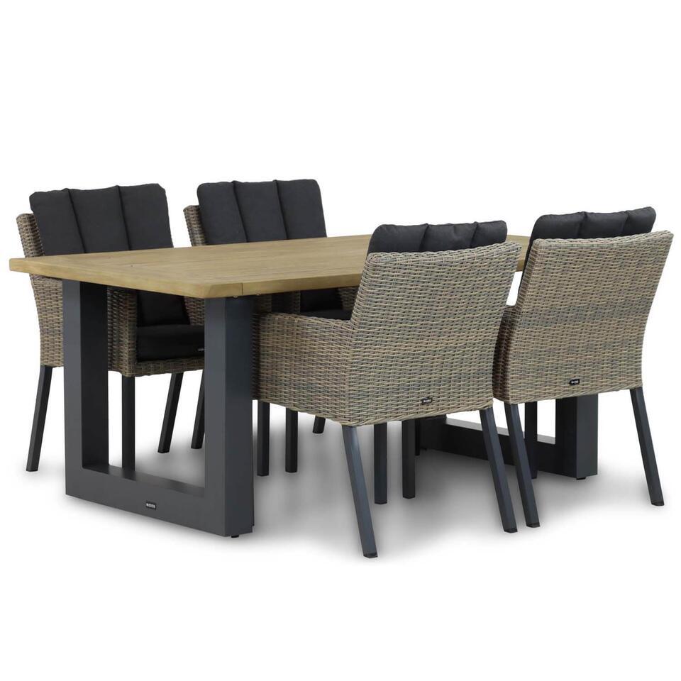 Garden Collections Oxbow/Talai 180 cm dining tuinset 5-delig De Garden Collections Oxbow/Talai 180 cm dining tuinset biedt alles waar jij naar op zoek bent in een tuinset. De stoere Garden Collections Oxbow dining tuinstoel levert met zijn brede zitting en comfortabele kussens een superieur zitcomfort. De moderne kubukleur van de kuip sluit mooi aan bij het pootstel van de tijdloze Lifestyle Talai dining tuintafel 180 x 100 cm. Zo kun jij deze zomer zorgeloos doorbrengen in je tuin! Meer weten? Stel je vragen online of per telefoon. We vinden het uiteraard nog leuker om je welkom te heten in één van onze Tuinmeubelshop megastores. De Garden Collections Oxbow/Talai 180 cm dining tuinset 5-delig bestaat uit: * 4 x Garden Collections Oxbow dining tuinstoel * 1 x Lifestyle Talai dining tuintafel 180 x 100 cm Eigenschappen Garden Collections Oxbow dining tuinstoel De Garden Collections Oxbow dining tuinstoel is een comfortabele tuinstoel met een landelijke uitstraling. Het frame van de tuinstoel is gemaakt van aluminium. Het aluminium heeft een poedercoating in de kleur antraciet. Poedercoaten is een elektrostatisch proces, waarbij onder extreme hitte een extra beschermlaag op het aluminium wordt aangebracht. Dit is een mooie, zeer duurzame coating. Het aluminium frame heeft daarnaast als voordeel dat het licht van gewicht is, waardoor je de tuinstoel gemakkelijk kunt verplaatsen. De Garden Collections Oxbow dining tuinstoel heeft een kuip van kunststof wicker. De wicker vlechtdraden hebben een mono core behandeling gehad. Dit houdt in dat de wicker draden door en door gekleurd zijn. De wicker vlechtdraad in de kleur kubu geeft deze tuinstoel een tijdloze uitstraling en is uitstekend te combineren met vele andere materialen. De Garden Collections Oxbow dining tuinstoel is weerbestendig en kan het hele jaar door buiten blijven staan. De tuinstoel wordt geleverd inclusief zit- en rugkussen. De kussens zijn voorzien van een speciale vuil- en waterafstotende coating. Bij geen gebruik adviseren wij om de kussens op een droge en goed geventileerde plek op te bergen of om de tuinstoel (in de zomermaanden) af te dekken met een Outdoor Cover beschermhoes. Wil je meer informatie? Neem gerust contact met ons op. Wij adviseren je graag! Eigenschappen Lifestyle Talai dining tuintafel 180 x 100 cm Het frame van de Lifestyle Talai dining tuintafel is gemaakt van aluminium. Dit aluminium is voorzien van een poedercoating. Deze poedercoating beschermt tegen roest- en corrosievorming. Aluminium is een zeer stevig materiaal, maar tevens licht van gewicht. Dit maakt het bijzonder praktisch en gebruiksvriendelijk. Het tafelblad van de Talai tuintafel is gemaakt van teakhout. Ons teakhout is afkomstig uit Indonesie en voorzien van het Indonesion Legal Wood keurmerk. Teakhout is een natuurproduct. Na verloop van tijd zal het op natuurlijke wijze vergrijzen. Dit proces versterkt het unieke karakter van je tuintafel. Wanneer je echter liever de originele kleur behoudt, adviseren wij om het hout tweemaal per jaar op kleur te houden met onze Garden Collections Teak Protector. Alvorens dit te doen, dien je de tafel eerst schoon te maken en te laten drogen.