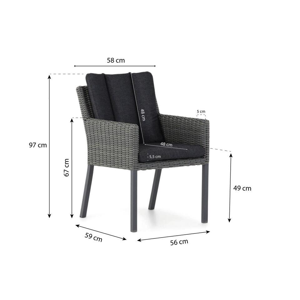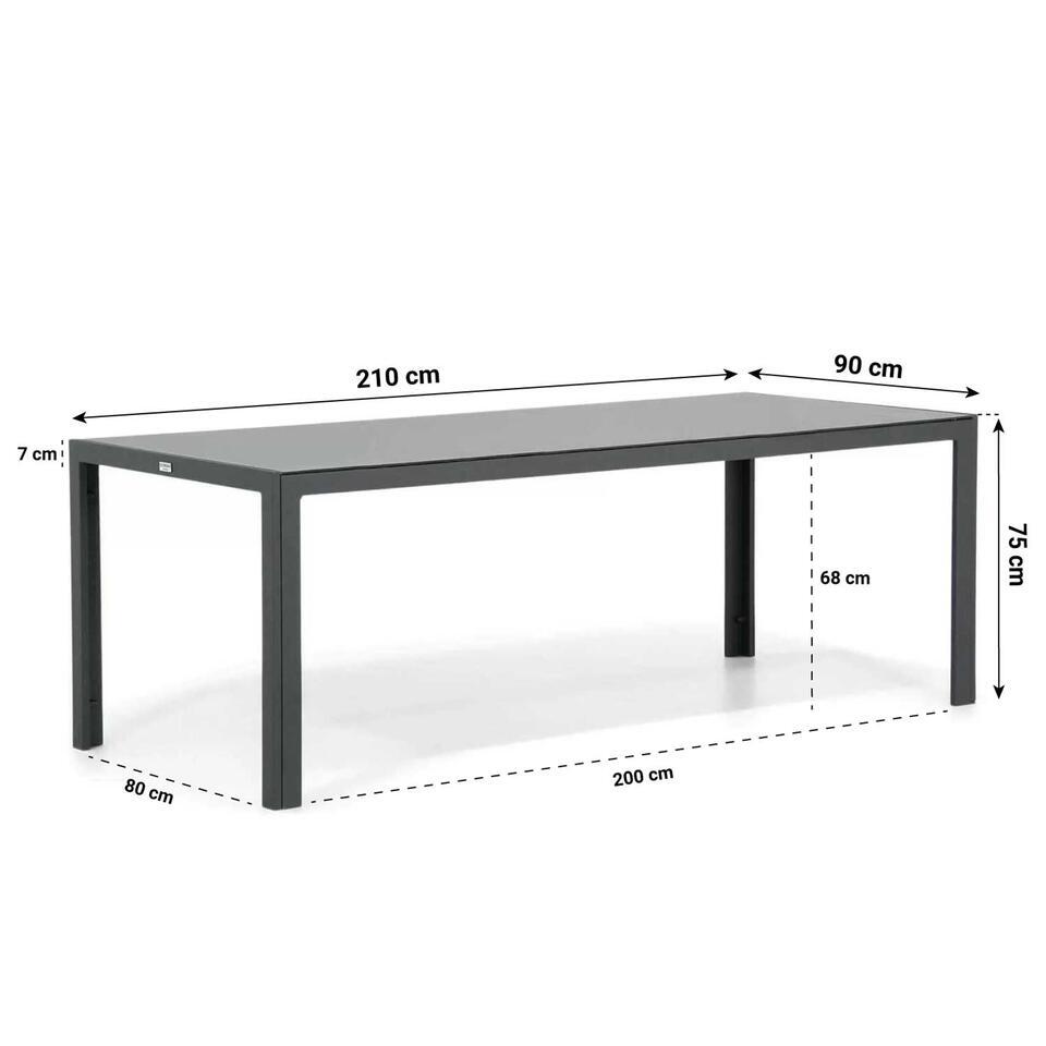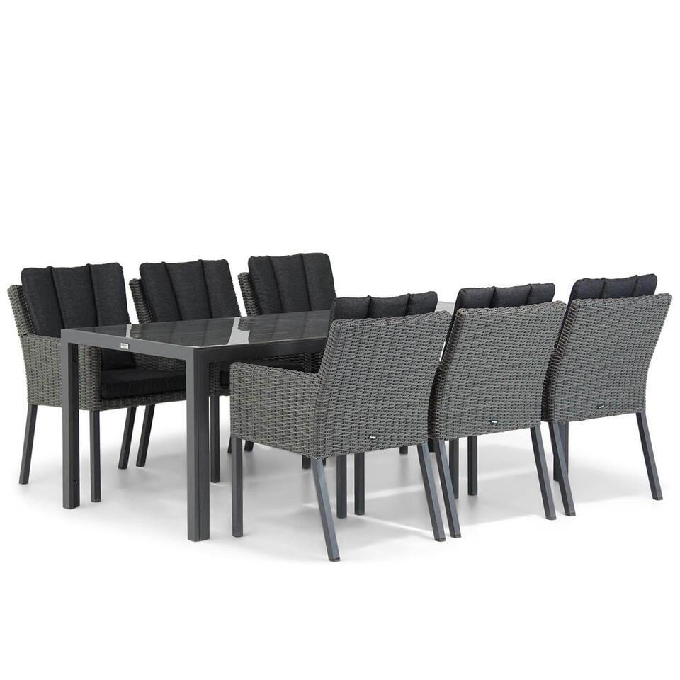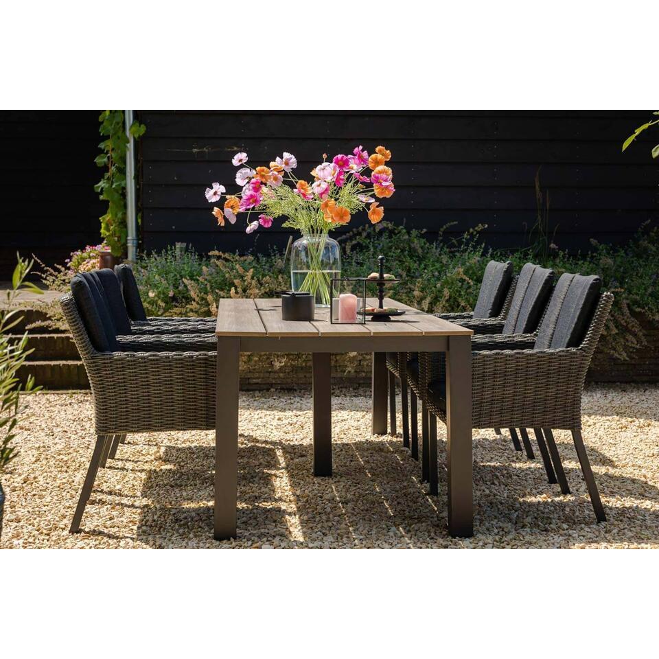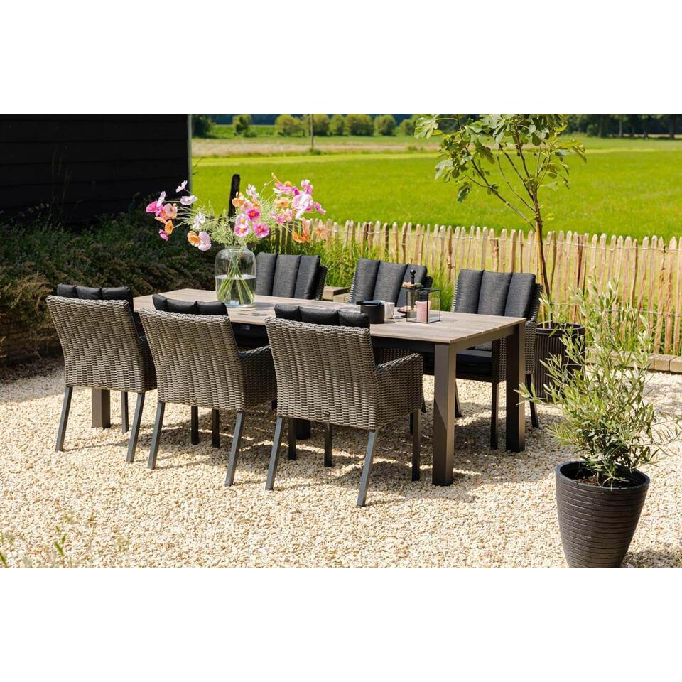 Garden Collections Oxbow/Mondello 210 cm dining tuinset 7-delig Een prachtige combinatie van strak aluminium en sfeervol wicker. Dat is de Garden Collections Oxbow dining tuinstoel in combinatie met de Domani Mondello dining tuintafel 210 x 90 cm. Deze 6-persoons tuinset maakt een stijlvolle en tijdloze indruk en past mooi op elk terras. Naast het mooie ontwerp biedt de Oxbow tuinstoel ook een optimaal zitcomfort. De stoel heeft namelijk een voorgevormde rugleuning en is uitgevoerd met een goed gevuld zit- en rugkussen. Het rugkussen is bovendien voorzien van een tweetal extra stiknaden, waardoor het kussen om je heen vormt. Wil je meer informatie over deze luxe tuinset? Neem contact met ons op of kom langs in één van onze tuinmeubelwinkels. Wij helpen je graag verder! De Garden Collections Oxbow/Mondello 210 x 90 cm dining tuinset 7-delig bestaat uit: * 6 x Garden Collections Oxbow dining tuinstoel off black * 1 x Domani Mondello dining tuintafel 210 x 90 cm Eigenschappen Garden Collections Oxbow dining tuinstoel off black De Garden Collections Oxbow dining tuinstoel bestaat uit een gepoedercoat aluminium frame met daarom een geweven wicker. Poedercoaten is een elektrostatisch proces. Hierbij wordt poeder op het aluminium aangebracht. Dit wordt verhit in een oven. Tijdens het uitharden worden de poederdeeltjes door de warmte eerst vloeibaar, vervolgens stroperig en tenslotte uitgehard tot een mooie, zeer duurzame coating op de tuinstoel. Aluminium heeft de mooie eigenschap dat het niet kan gaan roesten, daardoor is dit materiaal perfect voor buiten. De wicker vlechtdraden hebben een mono core behandeling gehad, dit houdt in dat de draden door en door gekleurd zijn. De wicker vlechtdraad, in de kleur off black, geeft deze tuinstoel een tijdloze uitstraling. Ook is deze kleur met vele andere materialen te combineren, zoals de Domani Mondello dining tuintafel 210x90 cm. De Garden Collections Oxbow dining tuinstoel kan het gehele jaar door buiten blijven staan. De stoel wordt geleverd inclusief zit- en rugkussen. Deze kussens hebben een coating wat ze water- en vuilafstotend maakt. Eigenschappen Domani Mondello dining tuintafel 210 x 90 cm De Domani Mondello dining 6 persoons tuintafel is een aluminium tuintafel met een gehard glazen blad. Aluminium heeft als voordeel dat het licht van gewicht is en onderhoudsvrij. Dit maakt de Domani Mondello dining tuintafel tot een duurzame aanschaf. Het tafelblad is gemaakt van gehard veiligheidsglas, en uitgevoerd in de kleur antraciet. Dit is een hard en sterk materiaal. De Garden Collections Oxbow dining tuinstoel is op hoogte afgestemd met deze tuintafel, zodat de stoel altijd goed onder de tuintafel past. De tafel is eenvoudig schoon te maken met een mild reinigingsmiddel.