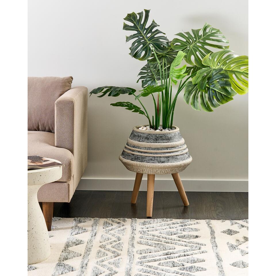 Bloempot met houten standaard. Breng een charmant accent in je huis met deze unieke handgeschilderde bloempot. De stevige houten poten zorgen voor een betrouwbare ondersteuning, terwijl de ingewikkelde textuur en harmonieuze kleuren prachtig passen bij vers groen. Hij is gemaakt van waterbestendig materiaal en is ontworpen om lang mee te gaan, of hij nu binnen of buiten staat. Een perfecte keuze voor industriële en boho-interieurs.