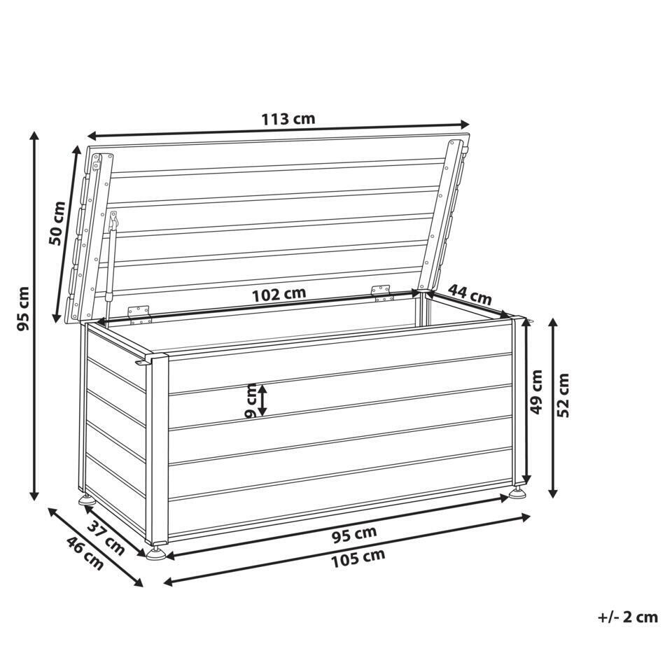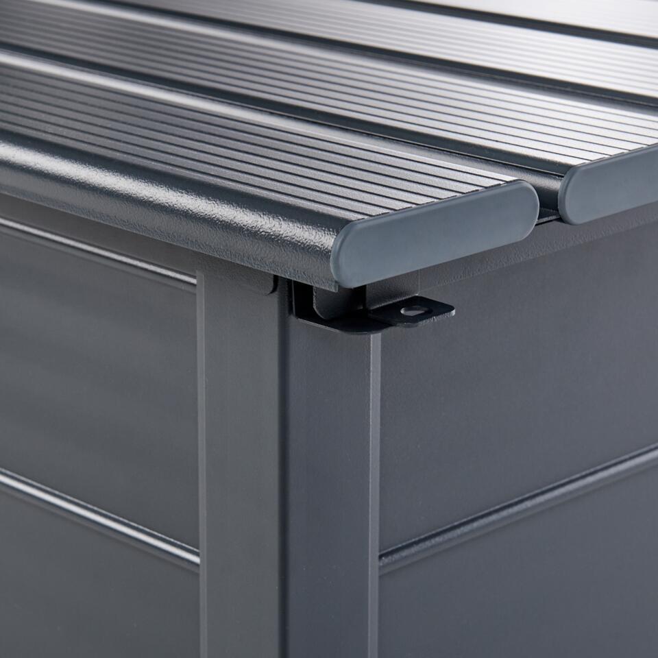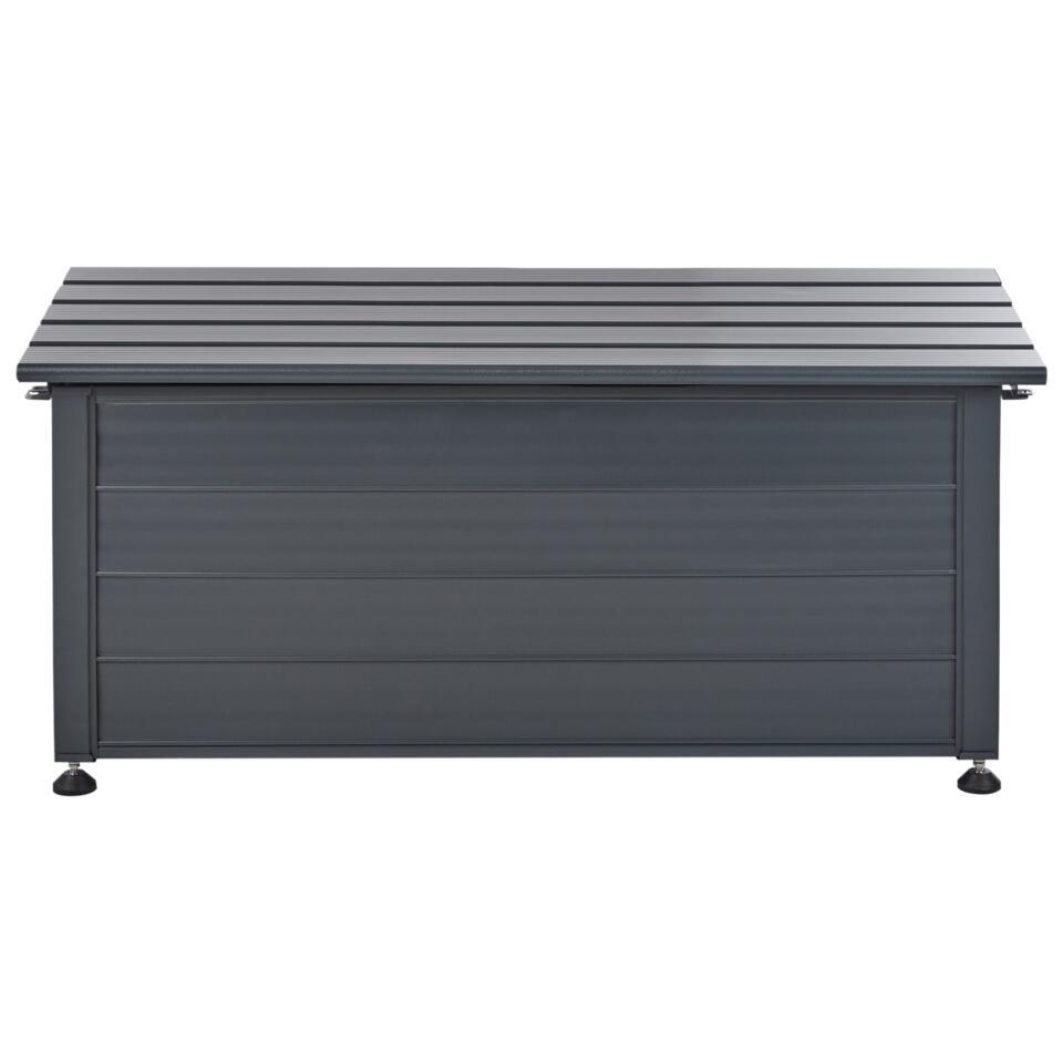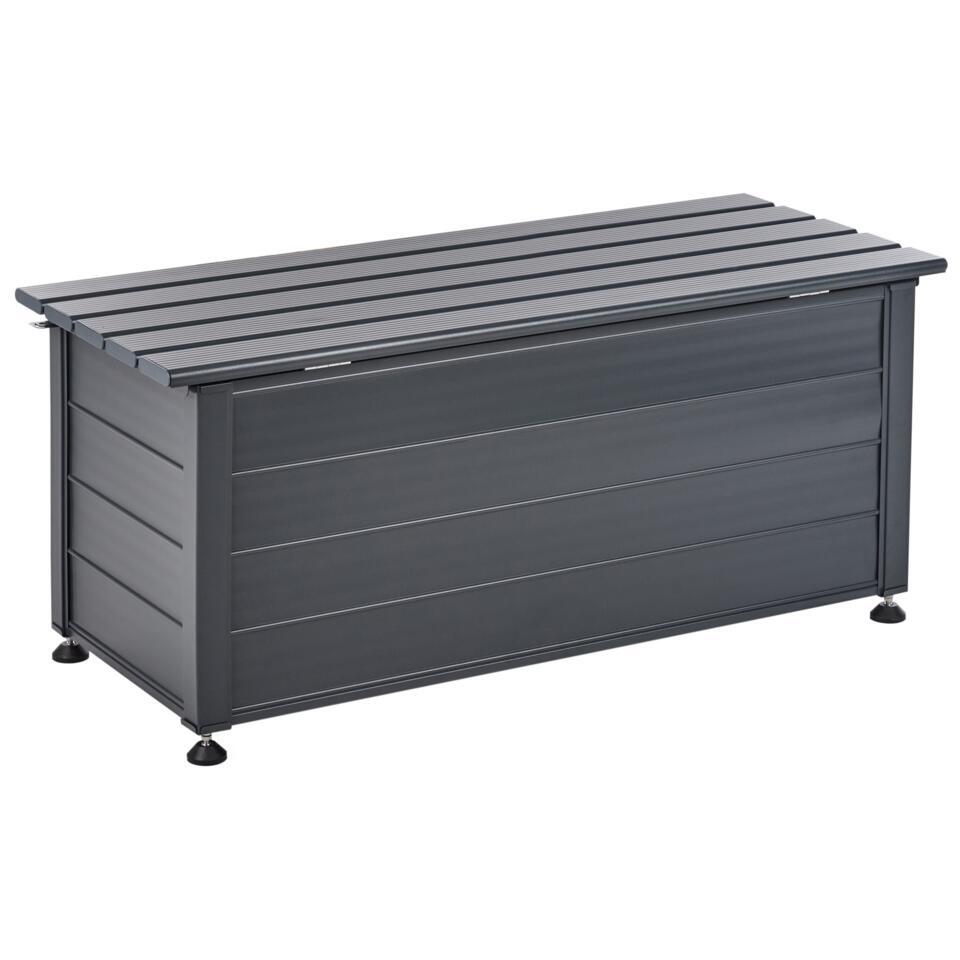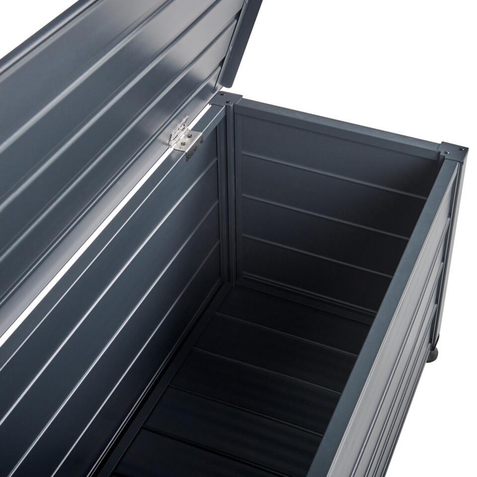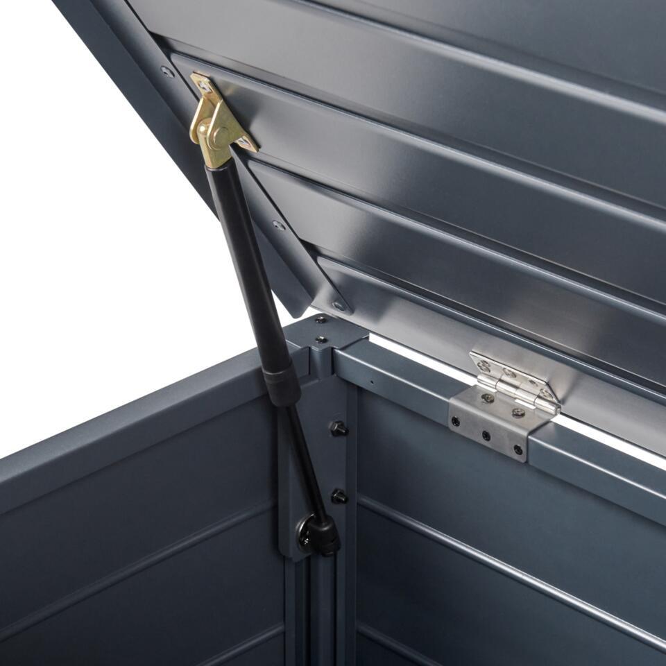 Buiten opbergbox. Deze opbergbox voor buiten is perfect voor je tuin of terras. Hij is gemaakt van stevig aluminium en bestand tegen water en wind. Deze ruime box, afgewerkt in een klassieke kleur, is geschikt voor allerlei apparatuur, gereedschap en accessoires en past in veel buitenomgevingen.