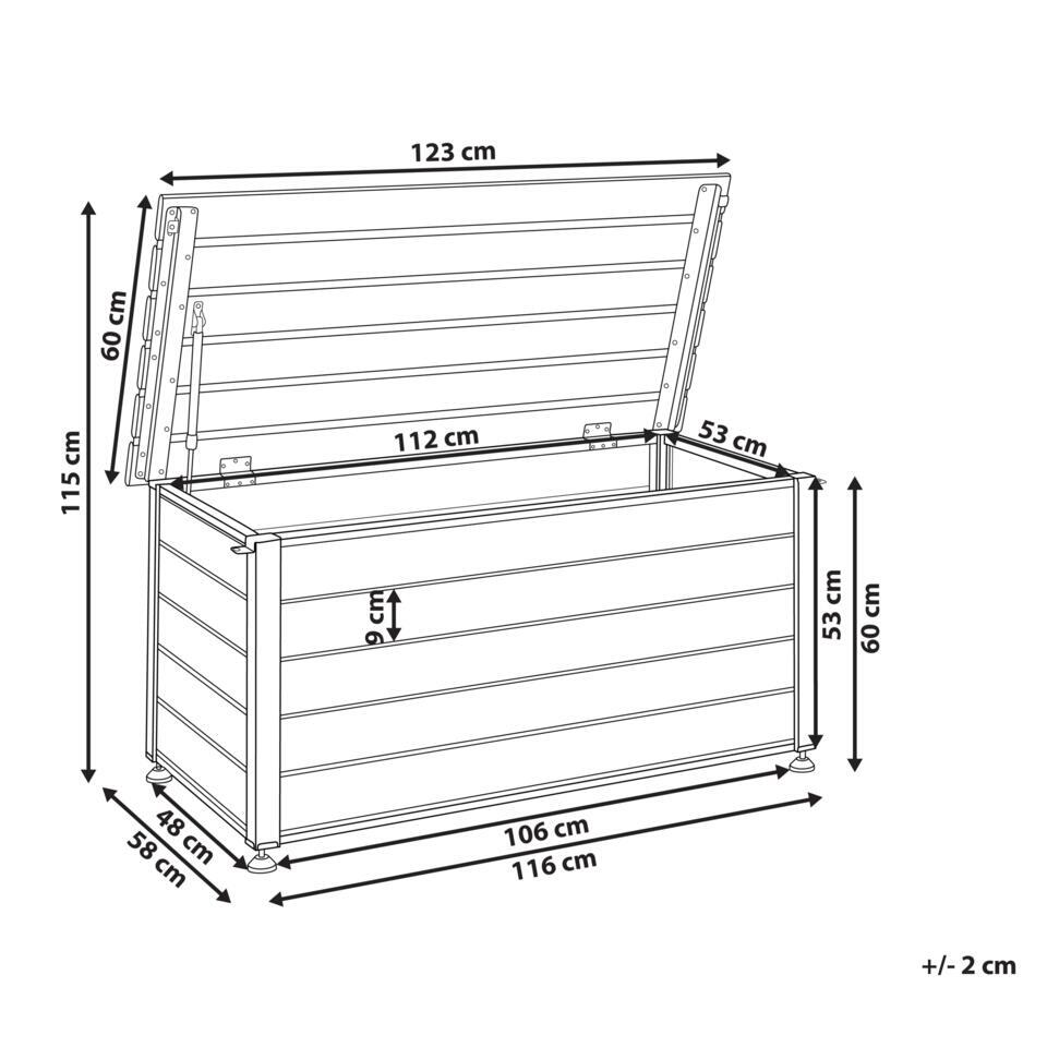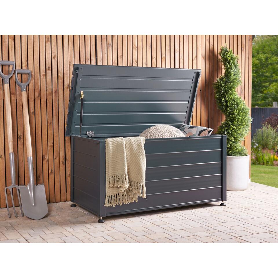 Buiten opbergbox. Deze opbergbox voor buiten is perfect voor je tuin of terras. Hij is gemaakt van stevig aluminium en bestand tegen water en wind. Deze ruime box, afgewerkt in een klassieke kleur, is geschikt voor allerlei apparatuur, gereedschap en accessoires en past in veel buitenomgevingen.