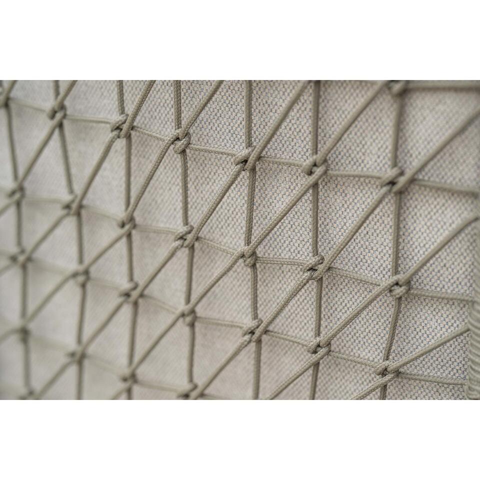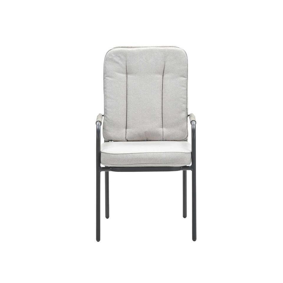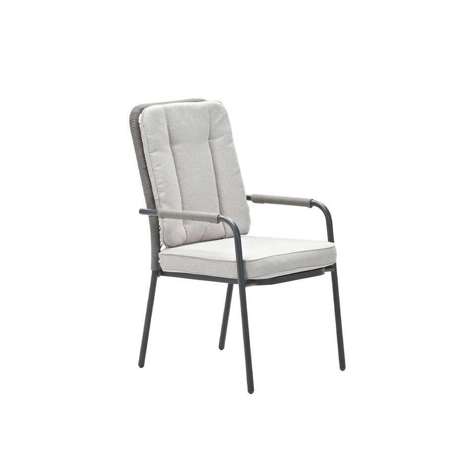 Het frame van deze tuinstoel is gemaakt van aluminium. Dit aluminium is bewerkt met een donker grijze coating. Aluminium heeft als voordeel dat het licht van gewicht is. De tuinstoelen zijn dus eenvoudig te verplaatsen en op te stapelen. De rugleuning is gemaakt van taupe kleurig rope. Dit touw is te vergelijken met touw dat in de scheepsvaart gebruikt wordt. Het touw is voorzien van een rubberen kern binnenin met daarin meerdere polyester draden voor de stevigheid. Om de rubberen kern zit solution dyed polyester rope. Dit betekent dat het touw door en door gekleurd is en verkleurt veel minder snel.
