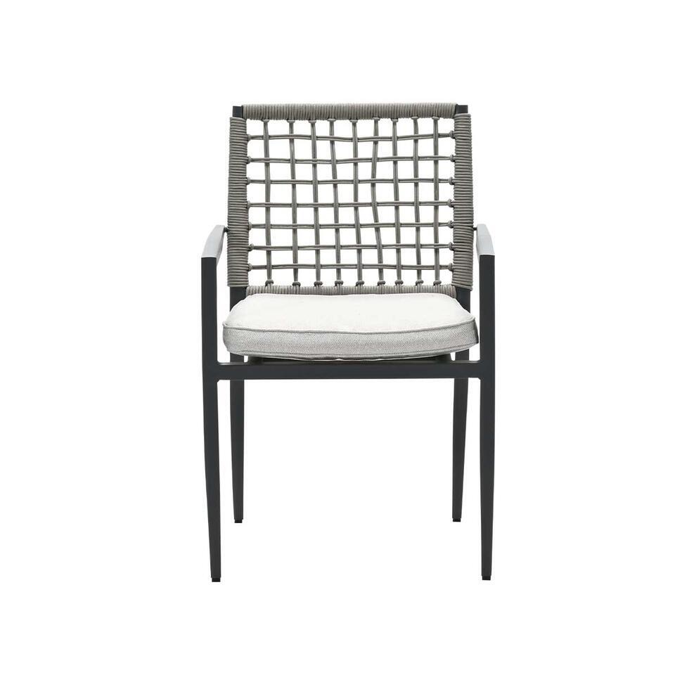 Het frame van deze tuinstoel is gemaakt van aluminium. Dit aluminium is bewerkt met een donker grijze coating. Aluminium heeft als voordeel dat het licht van gewicht is. De tuinstoelen zijn dus eenvoudig te verplaatsen en op te stapelen. De rugleuning is gemaakt van taupe kleurig rope. Dit touw is te vergelijken met touw dat in de scheepsvaart gebruikt wordt. Het touw is voorzien van een rubberen kern binnenin met daarin meerdere polyester draden voor de stevigheid. Om de rubberen kern zit solution dyed polyester rope. Dit betekent dat het touw door en door gekleurd is en verkleurt veel minder snel.