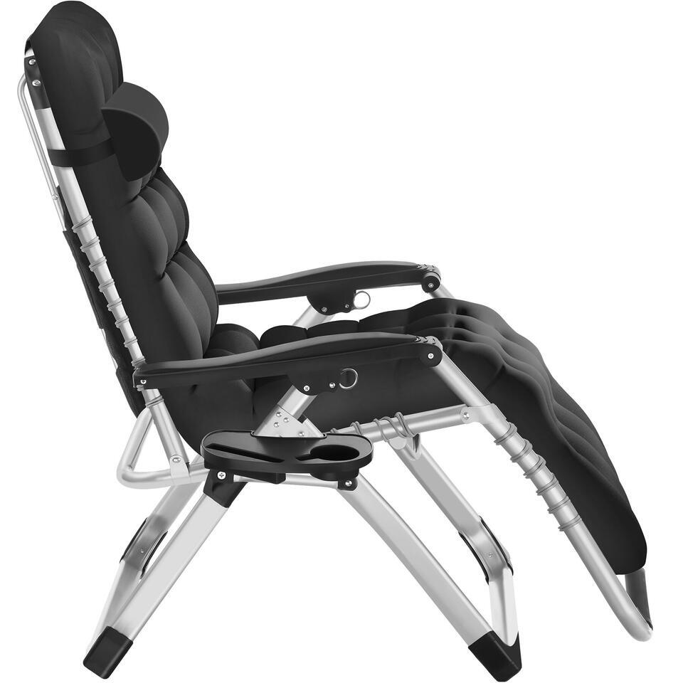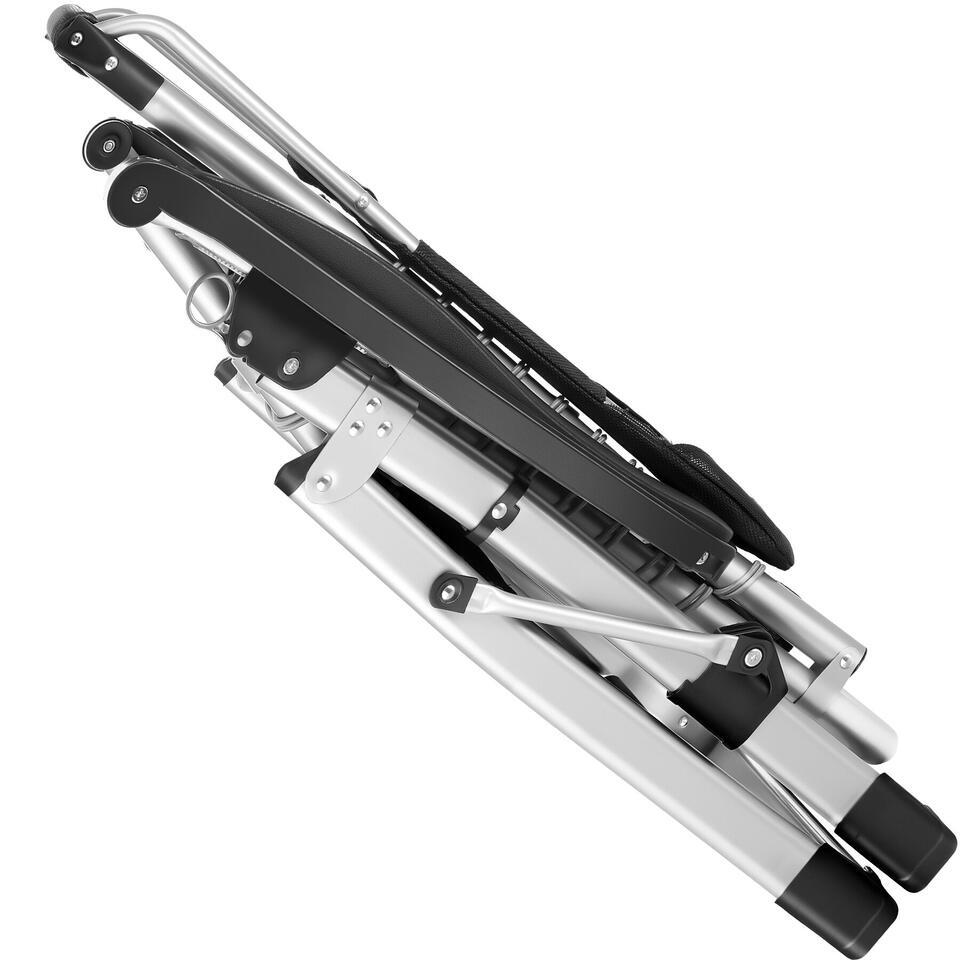 Het gepoedercoate stalen frame scoort niet alleen met een enorme stabiliteit en draagkracht. Een zijtafeltje biedt plaats voor drankjes en je mobieltje, terwijl een geïntegreerde opbergtas ruimte biedt voor tijdschriften, zonnebrand en meer.