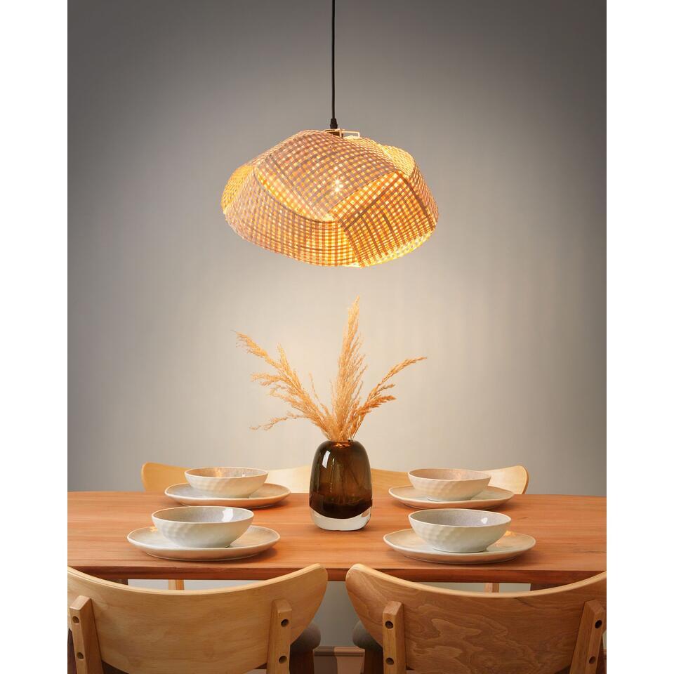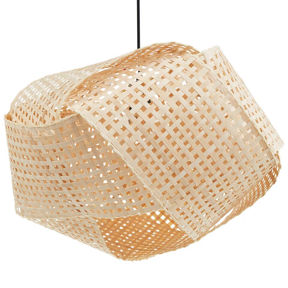 Hanglamp met geweven lampenkap. Ervaar de warmte van de natuur met deze hanglamp. Dit unieke stuk heeft een natuurlijke rieten bamboe kap die een warme gloed verspreidt en een serene en uitnodigende sfeer creëert. Het ingewikkelde geweven patroon voegt een vleugje textuur en verfijning toe. Deze hanglamp is perfect voor zowel moderne als rustieke interieurs en brengt een vleugje buiten naar binnen.