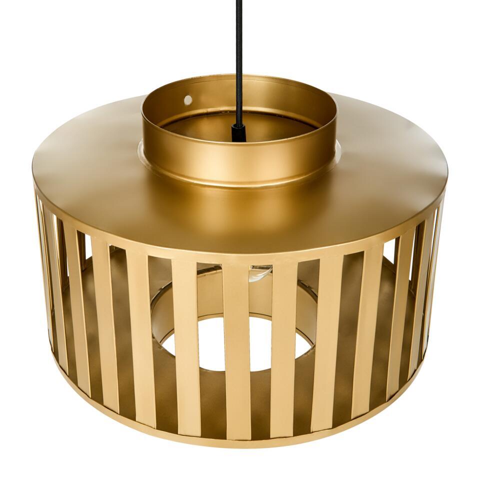 Metalen plafondlamp. Geef je huis een upgrade met deze opvallende hanglamp die modern design combineert met industriële charme. De lamp is gemaakt van messingkleurig ijzer en heeft een kooivormige kap die een unieke en open uitstraling heeft. Deze lamp zorgt voor gerichte verlichting en voegt karakter toe aan keukens, eetkamers of woonkamers. Het eenvoudige, gedurfde ontwerp maakt het een veelzijdige keuze voor verschillende interieurstijlen.