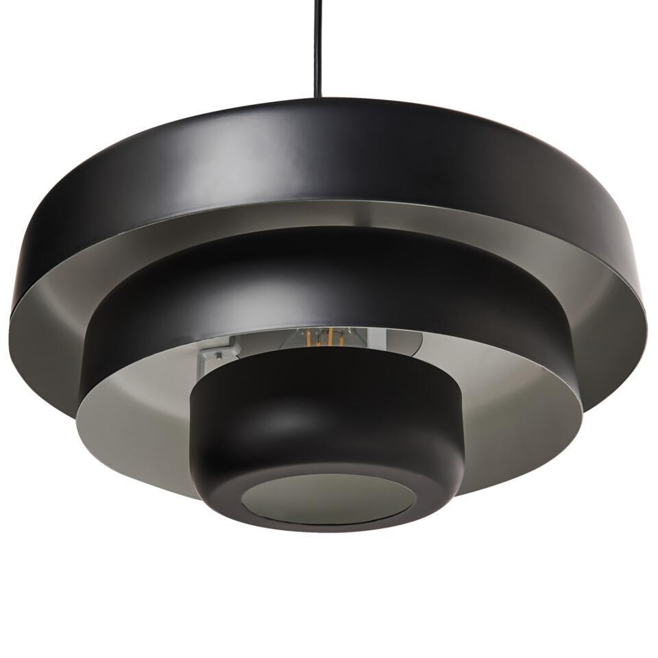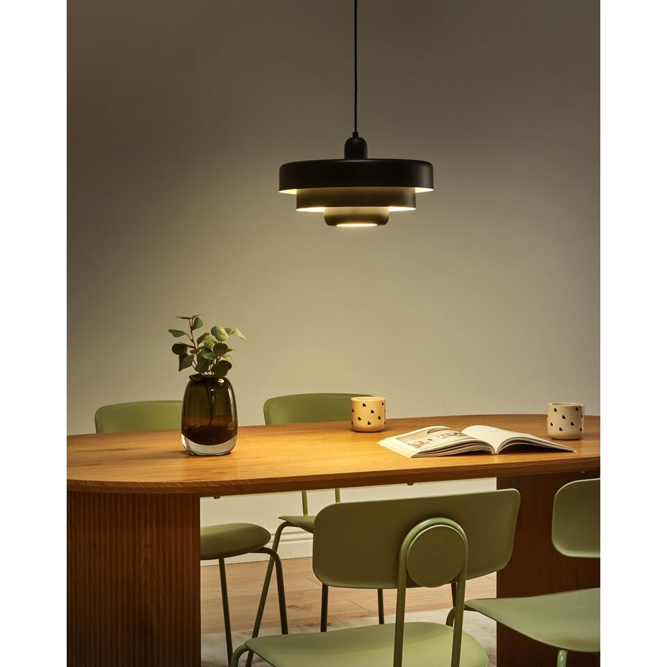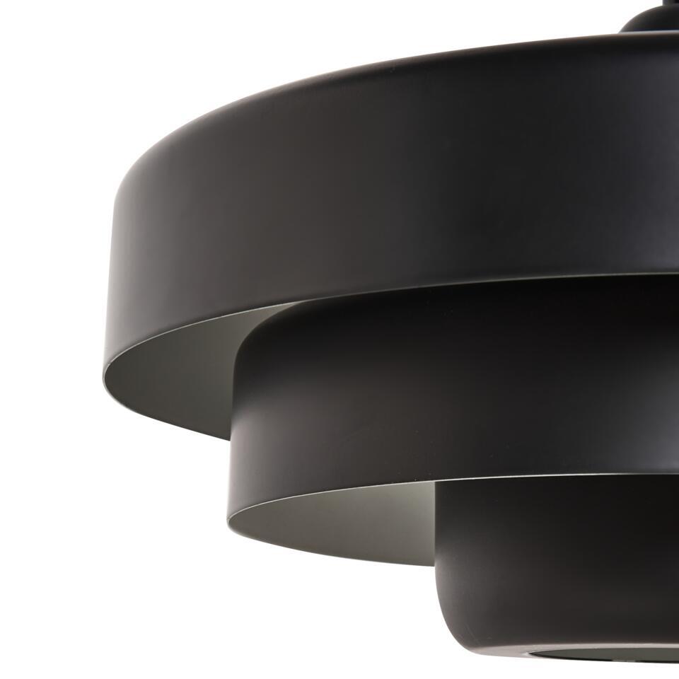 Moderne hanglamp. Deze hanglamp geeft je ruimte een strakke, moderne uitstraling met zijn gelaagde, sculpturale ontwerp en matzwarte afwerking. Hij is perfect om een gedurfd maar verfijnd accent toe te voegen boven de eettafel of in de gang. Door de zachte rondingen en ingetogen uitstraling past hij gemakkelijk in een eigentijdse of mid-century interieurstijl.