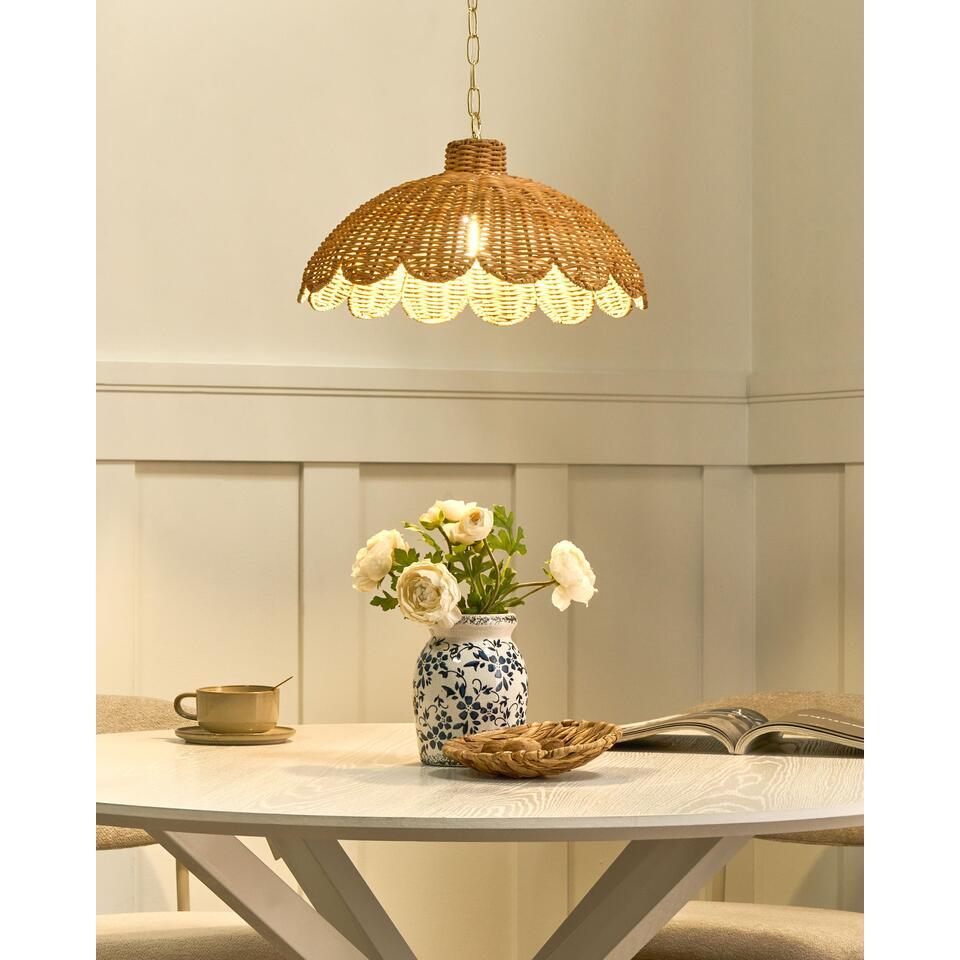 Geweven schelpvorm plafondlamp. Deze hanglamp met onweerstaanbare retro charme maakt een statement aan elk plafond. De handgemaakte lampenkap met decoratieve schulprand wordt prachtig aangevuld door de gouden fitting. Of hij nu boven een eettafel, in de keuken of in de woonkamer hangt, hij voegt meteen een warme, uitnodigende sfeer toe aan de ruimte.