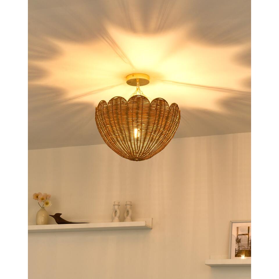 Geweven schelpvorm verzonken plafondlamp. Voeg een speciale look toe aan je kamer met deze unieke verzonken hanglamp, perfect om een vleugje boho charme en vintage vibes in je ruimte te brengen. De rotan lampenkap met geschulpte rand in combinatie met een subtiel gouden kapje creëert een mooie balans van textuur en elegantie. Het licht wordt zachtjes naar boven gericht en werpt zachte, decoratieve schaduwen op het plafond voor een gezellig, gelaagd effect. Ideaal als je op zoek bent naar iets speciaals dat toch warm en gastvrij aanvoelt.