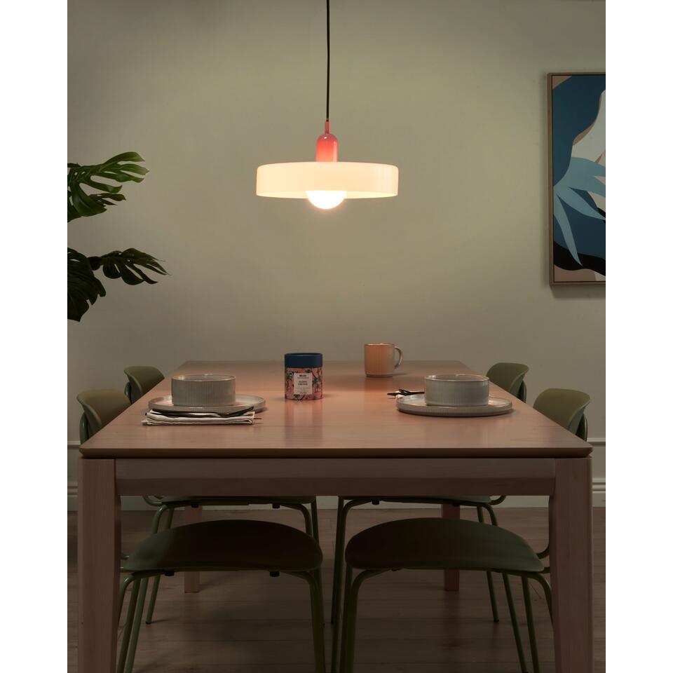 Ronde hanglamp. Deze accent hanglamp geeft een frisse draai aan je verlichting en combineert moderne stijl met subtiele retro inspiratie. De lamp heeft een ronde glazen kap aan de buitenkant met een delicate bolvormige kap aan de binnenkant die de lamp prachtig omlijst. Perfect voor in de hal, keuken of eetkamer, met een stijlvolle uitstraling.
