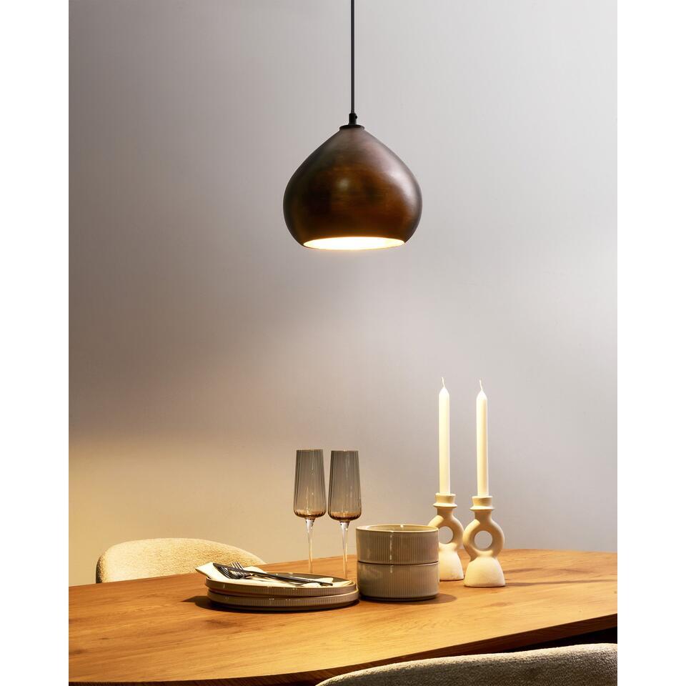 Houten hanglamp voor de eetkamer. Met zijn elegante druppelvormige silhouet en rijke, aardse afwerking voegt deze hanglamp een gevoel van warmte en evenwicht toe aan elke kamer. De gladde, zacht afgeronde vorm creëert een zachte visuele impact, terwijl de open onderkant zorgt voor een helder, gericht licht - ideaal voor eethoeken, keukens of leeshoekjes. Een tijdloos ontwerp dat geweldig samengaat met zowel moderne als rustieke interieurs.