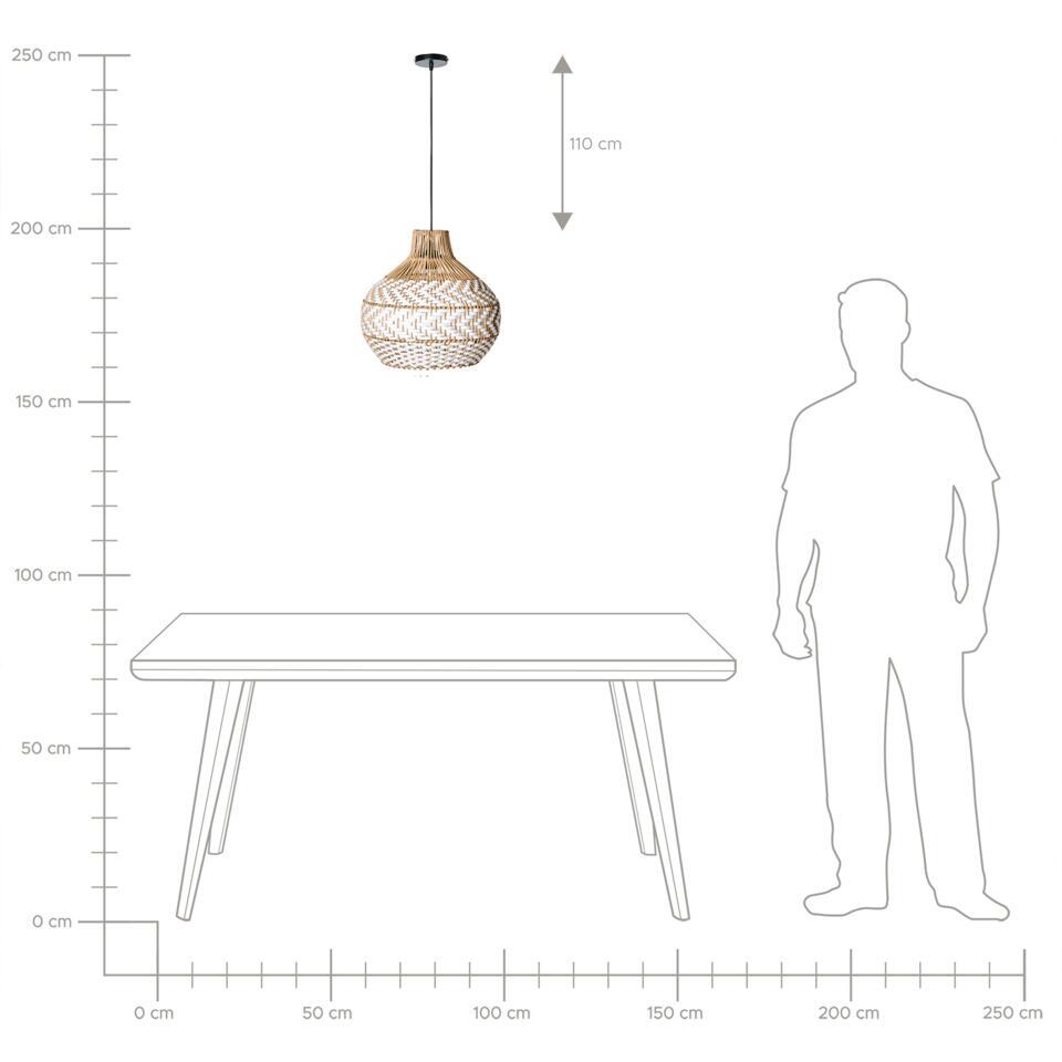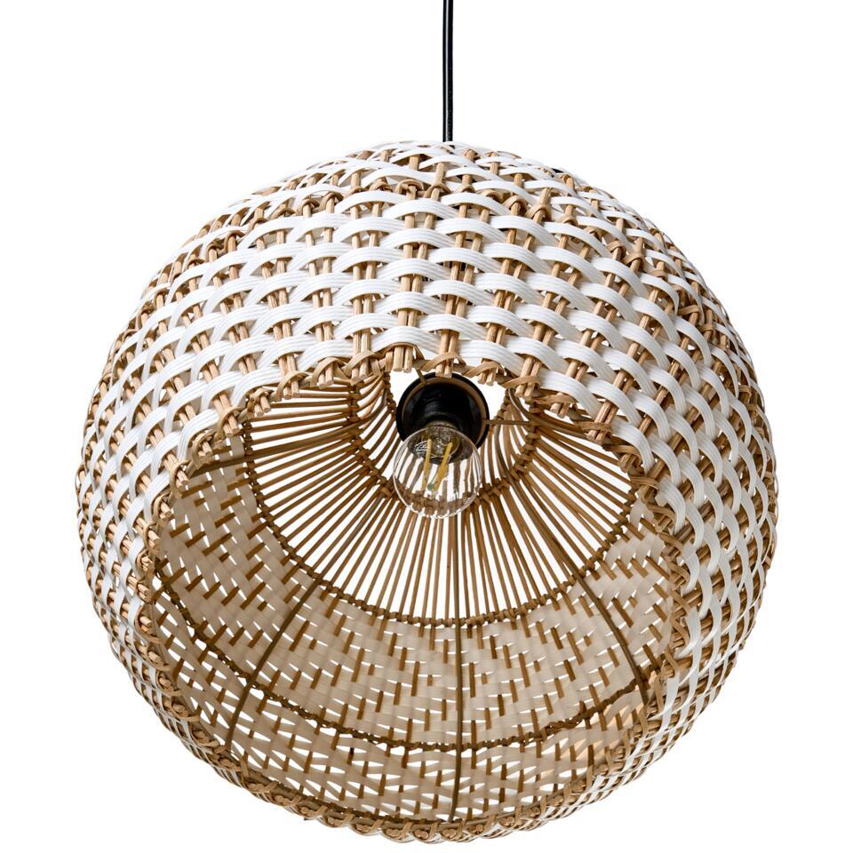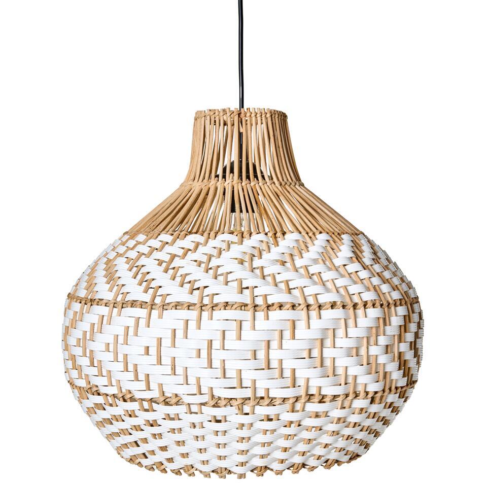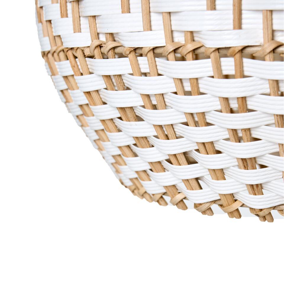 Hanglamp in boho stijl. Creëer een boho-geïnspireerd toevluchtsoord met deze handgemaakte hanglamp. De geweven rotan kap, een mix van witte en natuurlijke tinten, brengt een strandachtige, organische charme in je huis en straalt een zacht, uitnodigend licht uit dat een warme en ontspannen sfeer creëert. Deze lamp wordt ondersteund door een robuust ijzeren frame, en combineert duurzaamheid met moeiteloze stijl, waardoor het een perfect middelpunt is voor elke kamer.