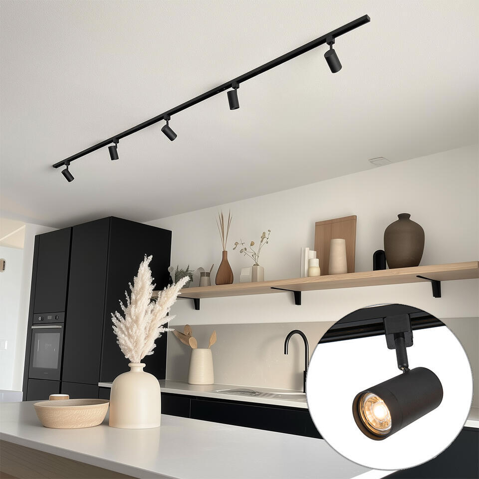 Dit railsysteem, genaamd Jeana, met vijf moderne railspots is een waardige toevoeging aan je interieur! Deze railspots passen perfect in het straatje van de nieuwe woonstijltrend 'Modern Clean'. De rail komt in 3 stukken en is totaal 286 cm lang, 17 cm hoog en heeft een breedte van 3,4 cm. In de spots passen GU10 lichtbronnen (max. 50 Watt), die wel nog los moeten worden bijbesteld. Het pakket bestaat uit 3 losse railstukken, 2 koppelstukjes, een L-koppelstuk en 5 Jeana spotjes. De railspots zijn verstelbaar en geschikt voor gebruik in combinatie met een externe dimmer (dimmer niet inbegrepen). Je kunt kiezen voor een rechte rail, maar je hebt ook de mogelijkheid tot het maken van bochten. Dit zijn 1-fase spots, wat wil zeggen dat alle lichtbronnen op de rail samen aangestuurd worden en dus ook altijd samen gedimd of ingeschakeld worden. Wacht niet langer en haal deze mooie rails nu nog in huis. Dan is jouw interieur pas echt compleet!