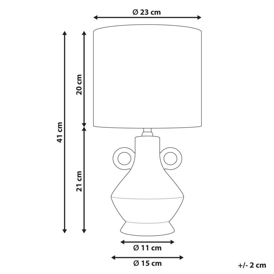 Tafellamp in klassieke stijl. Voeg een opvallende charme toe aan je huis met deze stijlvolle tafellamp, perfect voor elke kamer. De keramieken voet, met twee decoratieve handgrepen, heeft een gladde afwerking die mooi contrasteert met de geweven textuur van de stoffen kap. Als hij brandt, straalt hij een warme sfeer uit, ideaal voor een woon- of slaapkamer.