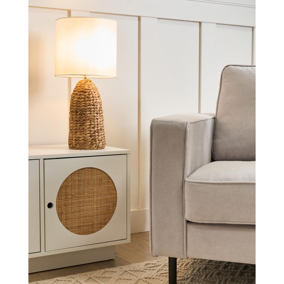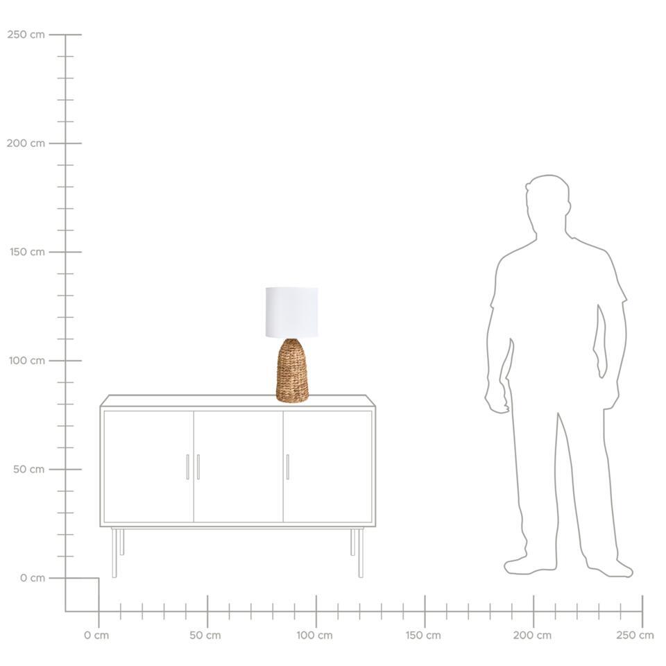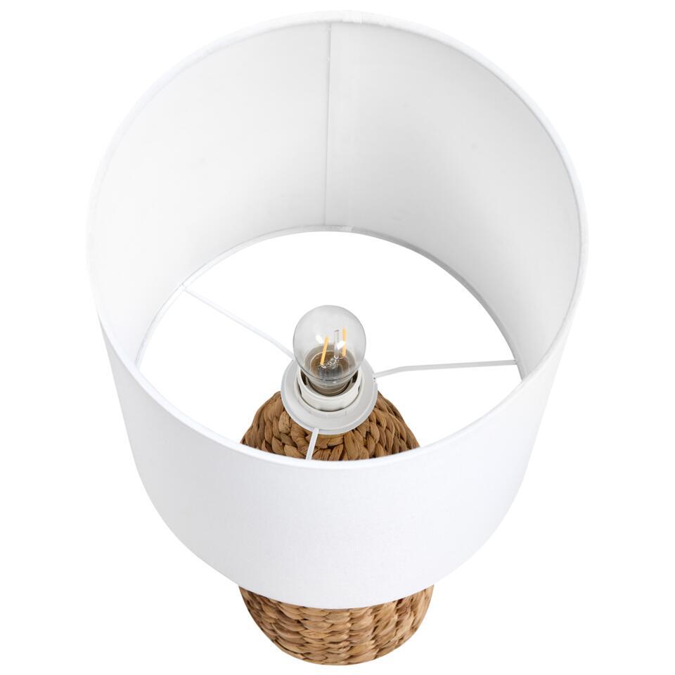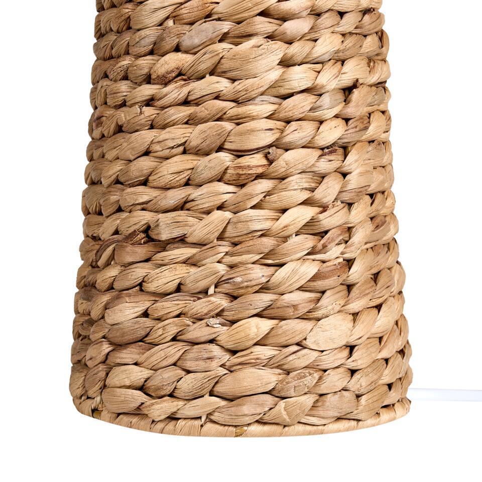 Rieten tafel lamp. Deze moderne tafellamp heeft een opvallende basis gemaakt van natuurlijk gevlochten waterhyacint, wat zorgt voor een unieke textuur en een warme, organische uitstraling. De lamp is gecombineerd met een witte lampenkap, die zorgt voor een heldere en gelijkmatige lichtverdeling. Deze lamp is ideaal om een modern en natuurlijk element toe te voegen aan je woon- of slaapkamer.
