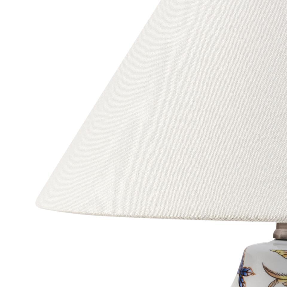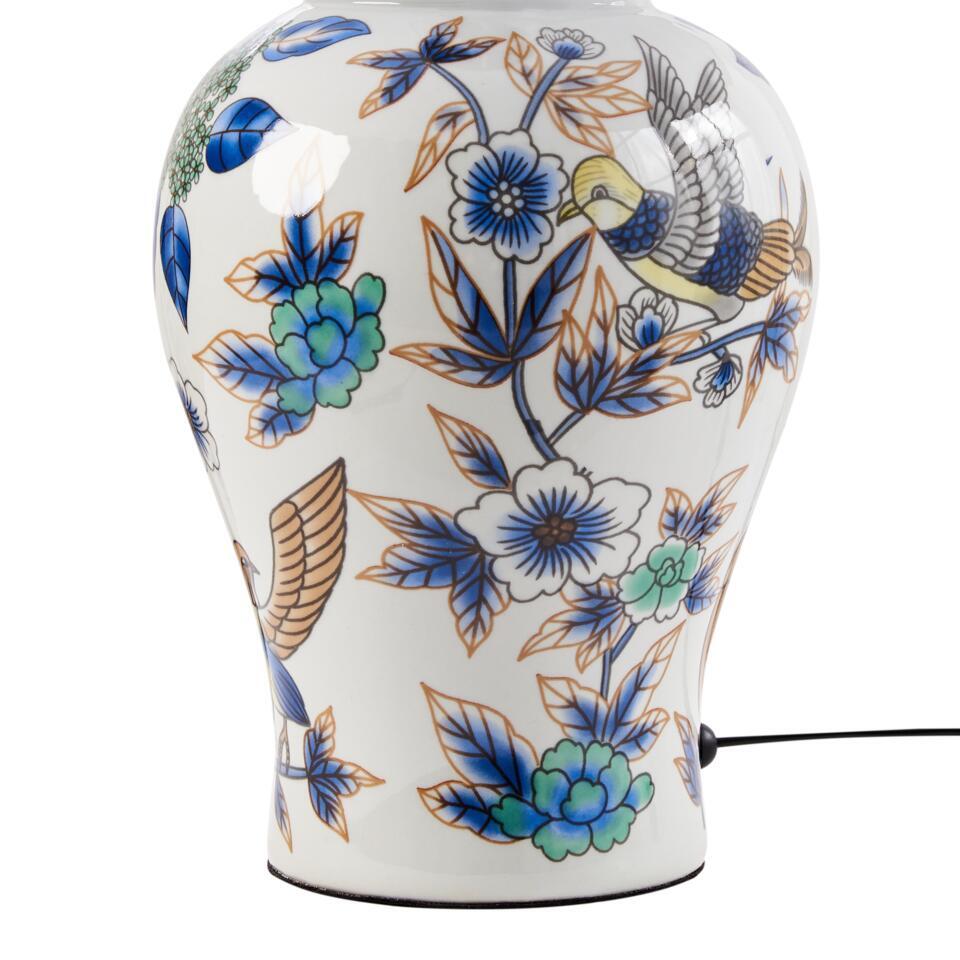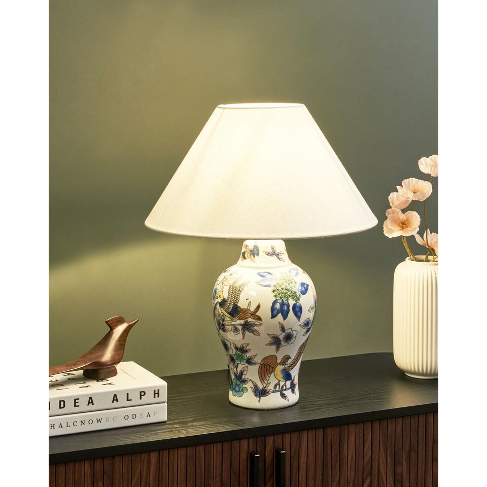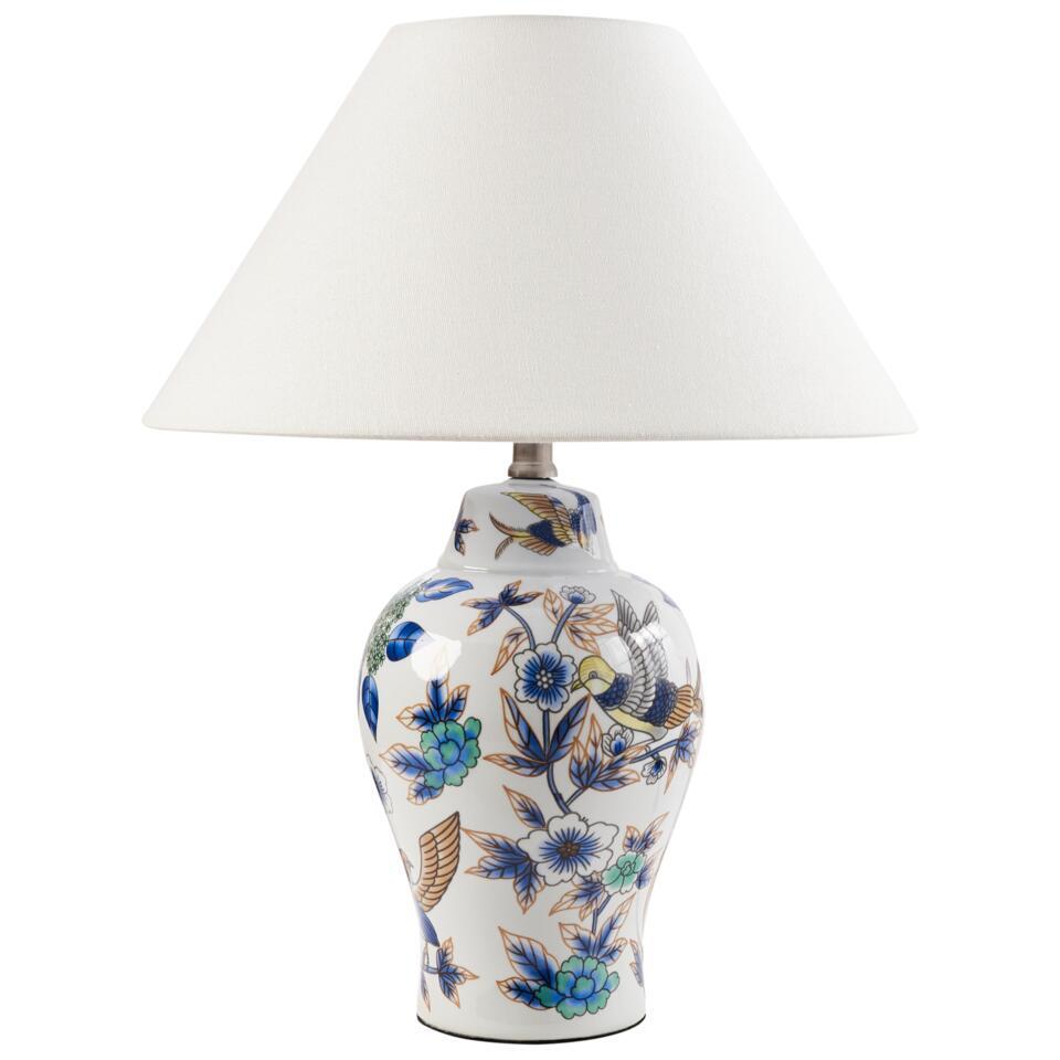 Porseleinen lamp met bloemenpatroon. Deze tafellamp is een perfecte mix van schoonheid en praktisch nut. De duurzame porseleinen voet, versierd met een bloemmotief, is gemakkelijk te onderhouden, terwijl de linnen kap een zachte, uitnodigende gloed verspreidt, perfect voor elke kamer. De tijdloze charme voegt een decoratief tintje toe aan je interieur.