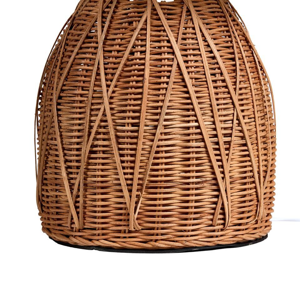 Rattan tafel lamp. Breng natuurlijke charme in je interieur met deze handgemaakte tafellamp. De basis is geweven van natuurlijk rotan, wat zorgt voor een rijke textuur en een organische esthetiek. De lamp wordt aangevuld door een witte stoffen kap, die zorgt voor een brede en diffuse verlichting. Deze lamp is ideaal voor een kust, boho of eclectische inrichting.