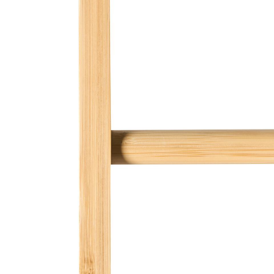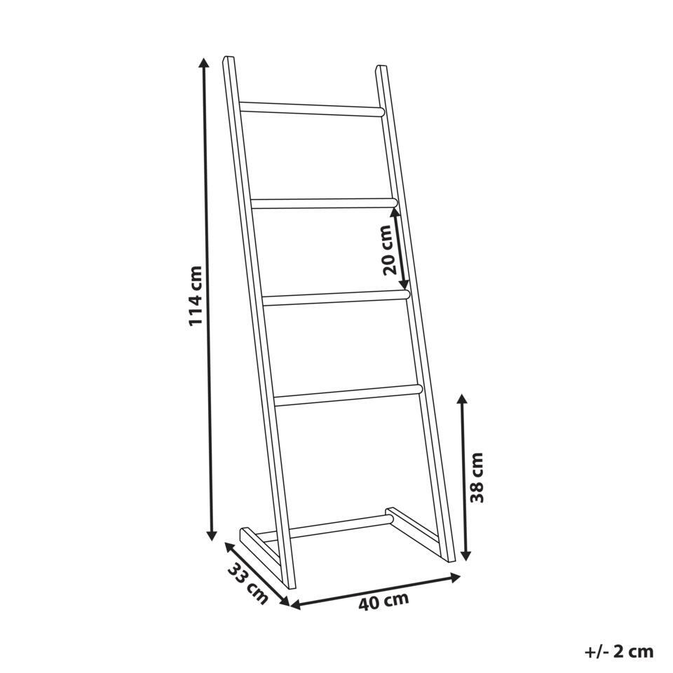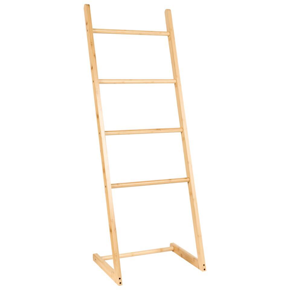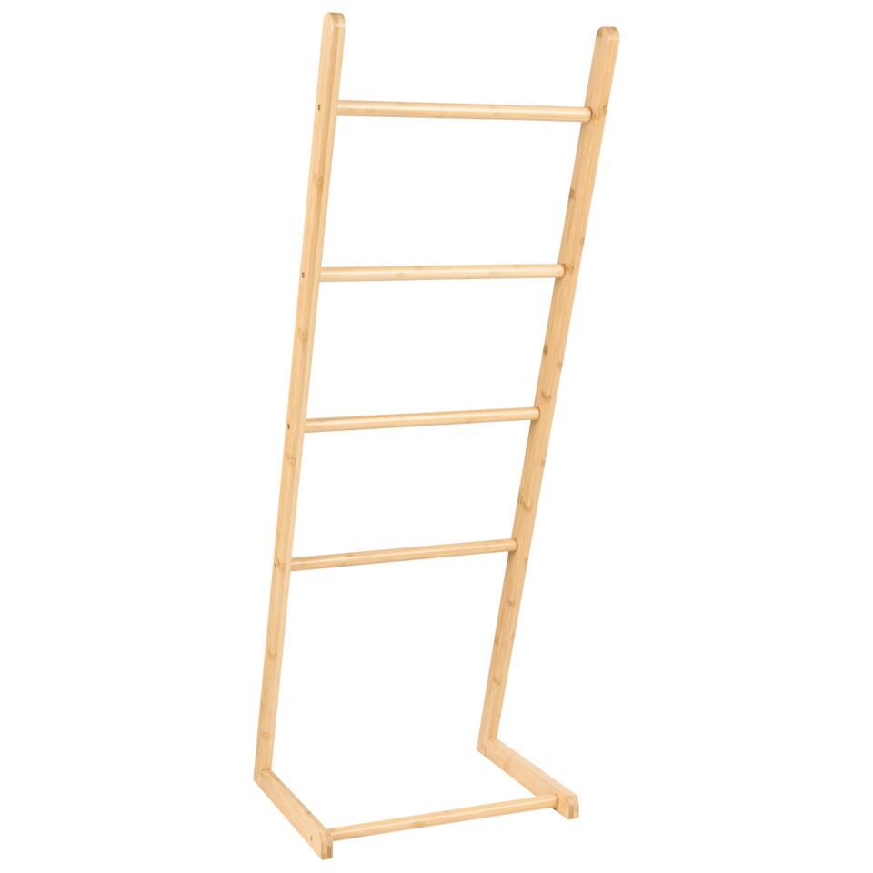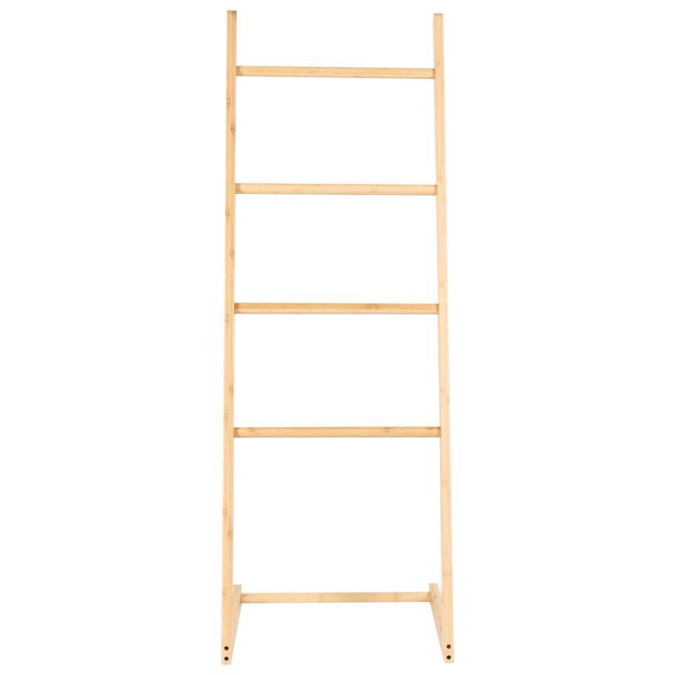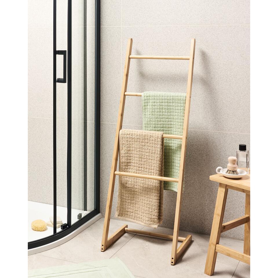 Houten ladder handdoek rek. Deze vrijstaande handdoekladder biedt een eenvoudige en stijlvolle manier om je badkamer georganiseerd te houden. Hij is gemaakt van bamboehout, geïnspireerd door de natuur en ontworpen om zowel minimalistisch als functioneel te zijn. Met vier treden kun je handdoeken gemakkelijk ophangen en voegt het een vleugje natuurlijke elegantie toe aan je ruimte. Het strakke ontwerp past perfect in elke moderne badkamer.