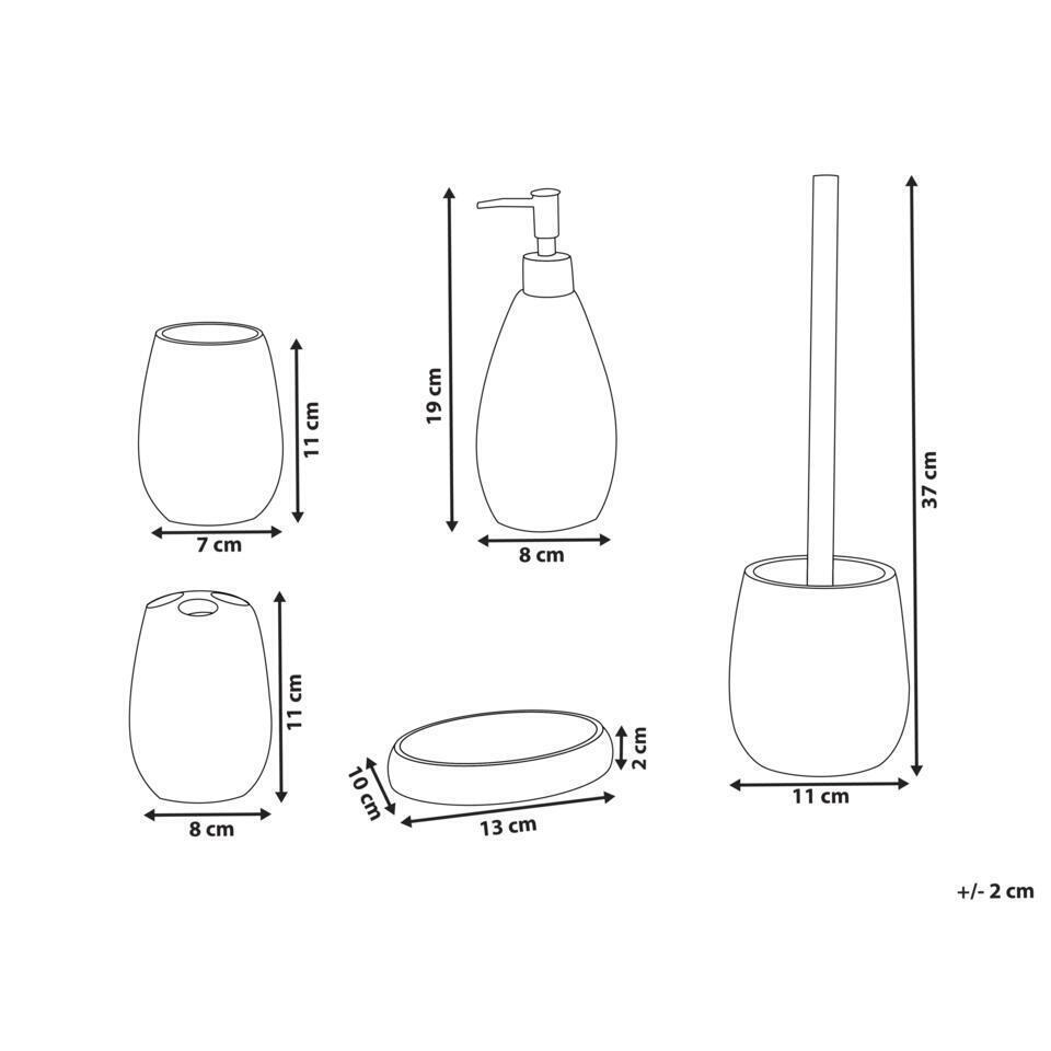 Alles in een badkamer accessoire set. Deze set essentiële accessoires heeft alles wat je nodig hebt om je badkamer er netjes en verzorgd uit te laten zien. Het bestaat uit een beker, tandenborstelhouder, zeepbakje, toiletborstel en zeeppompje en is een praktische aanvulling die elke dag van pas komt. Elk onderdeel is gemaakt van duurzaam polyresin, ontworpen om regelmatig gebruik te weerstaan en er toch stijlvol uit te zien.