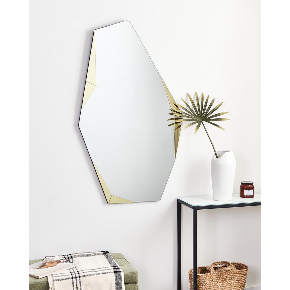 Assymetrische wandspiegel. Deze moderne spiegel met asymmetrische vorm is een functionele decoratie die in elke kamer past. De scherpe randen van de spiegel zonder frame, aangevuld met stukjes goudkleurig glas, geven de indruk van een moderne organische stijl. Dankzij de haken aan de achterkant kun je hem gemakkelijk overal ophangen.