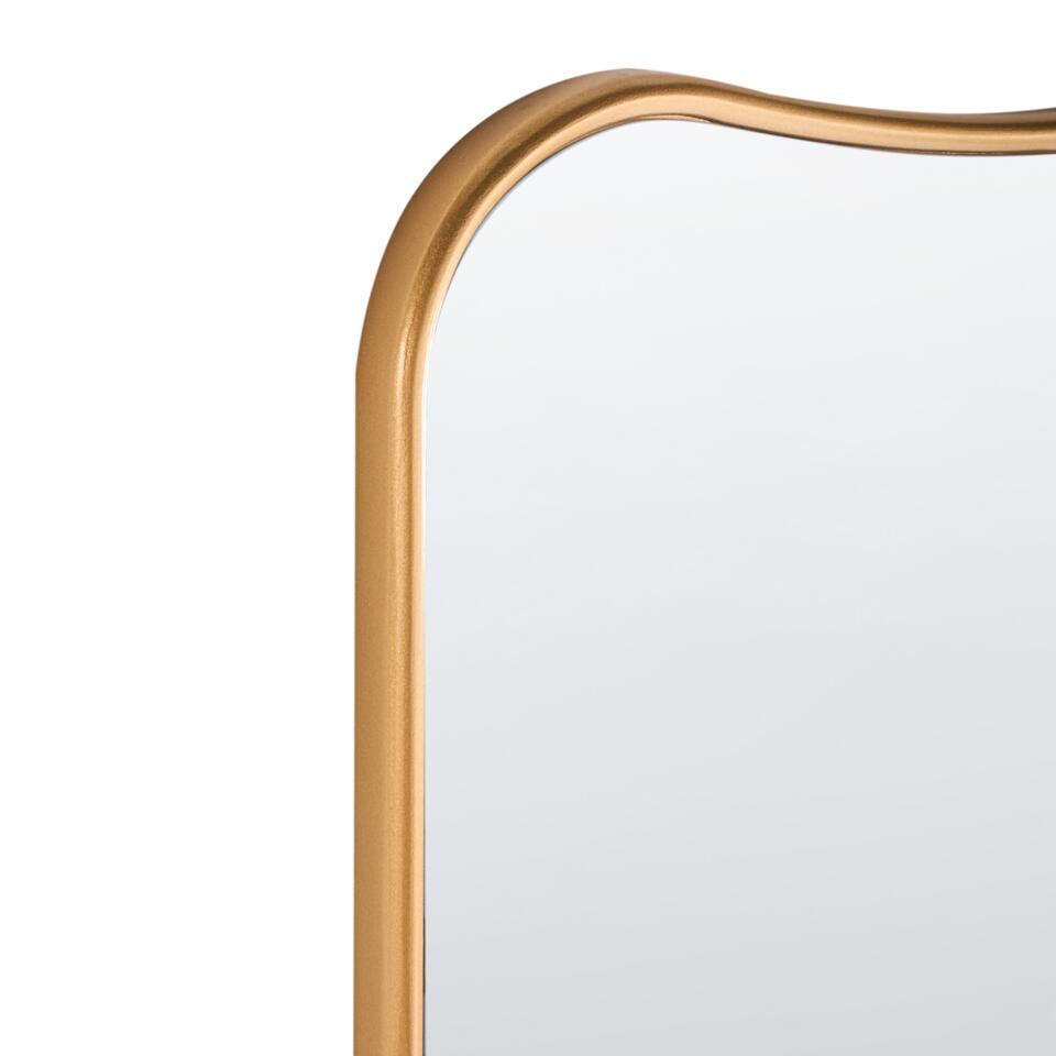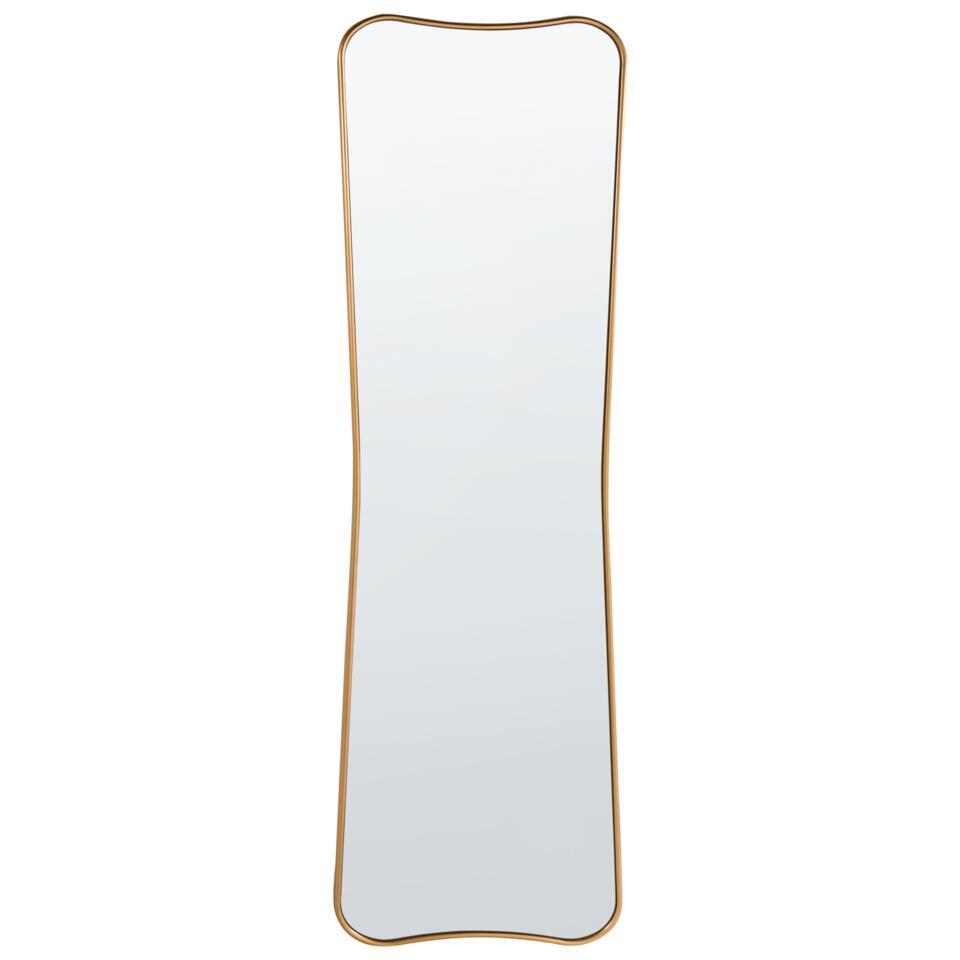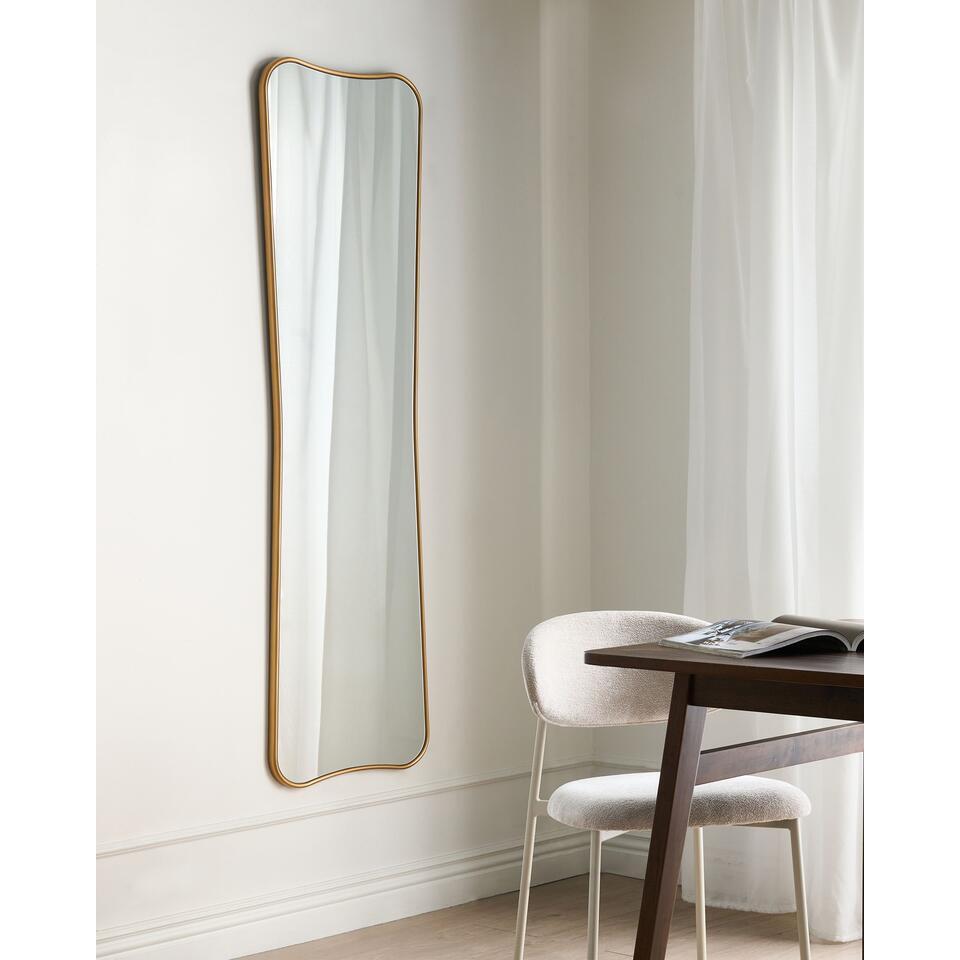 Hangende spiegel met golvend gouden frame. Voeg een vleugje elegantie toe aan elke ruimte met deze hoge wandspiegel met een warme, gouden lijst. De organische vorm zorgt voor visuele interesse en past bij verschillende interieurstijlen, van modern en minimaal tot chique en eigentijds. Het formaat over de hele lengte maakt hem praktisch voor dagelijks gebruik, terwijl hij de ruimte visueel vergroot en opfleurt. Of hij nu in een hal, slaapkamer of kleedkamer staat, hij dient zowel decoratieve als functionele doeleinden. De wandmontage is snel en eenvoudig dankzij de ophangmaterialen aan de achterkant.
