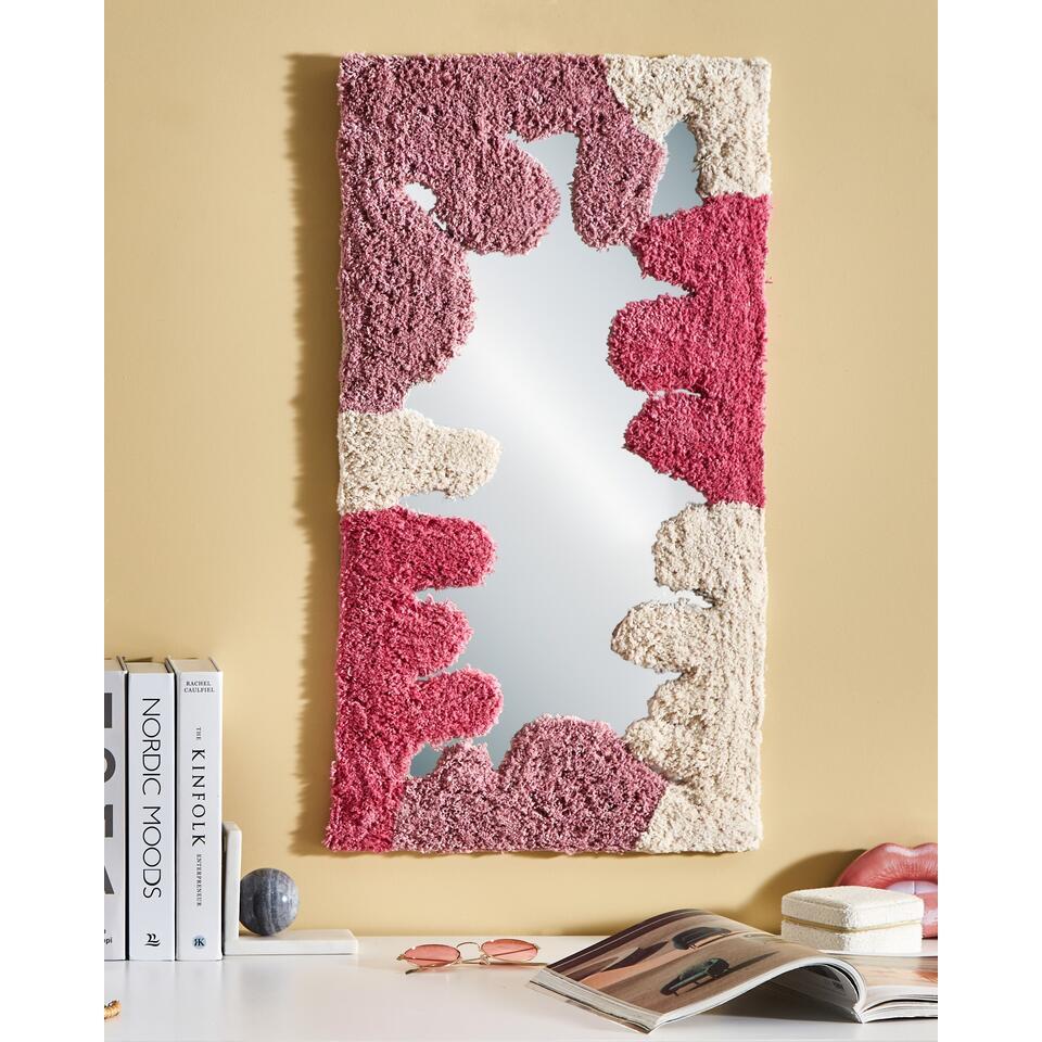 Getufte katoenen hangende spiegel. Fleur elke kamer op met deze charmante decoratieve spiegel, ontworpen om een vleugje warmte en stijl toe te voegen. De katoenen textuur in prachtige roze tinten brengt zowel gezelligheid als kleur en geeft de ruimte een uniek karakter. Deze spiegel is perfect voor de slaapkamer, woonkamer of hal en heeft handige haken voor eenvoudige installatie.