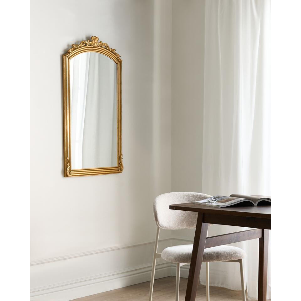 Boogvormige grote spiegel met sierlijke details. Deze grote, traditionele wandspiegel brengt tijdloze elegantie in elke ruimte. De klassieke gebogen vorm, versierd met prachtige decoratieve details en de gouden kleur en verweerde afwerking maken het een stijlvolle en charmante aanvulling voor zowel traditionele als meer eclectische interieurs. Het frame is gemaakt van stevig metaal, wat garant staat voor eenvoudig onderhoud en langdurige schoonheid. Of hij nu in een hal wordt opgehangen of in de woonkamer tegenover het raam om het visueel te vergroten, deze spiegel zal zeker een opvallend designelement worden.