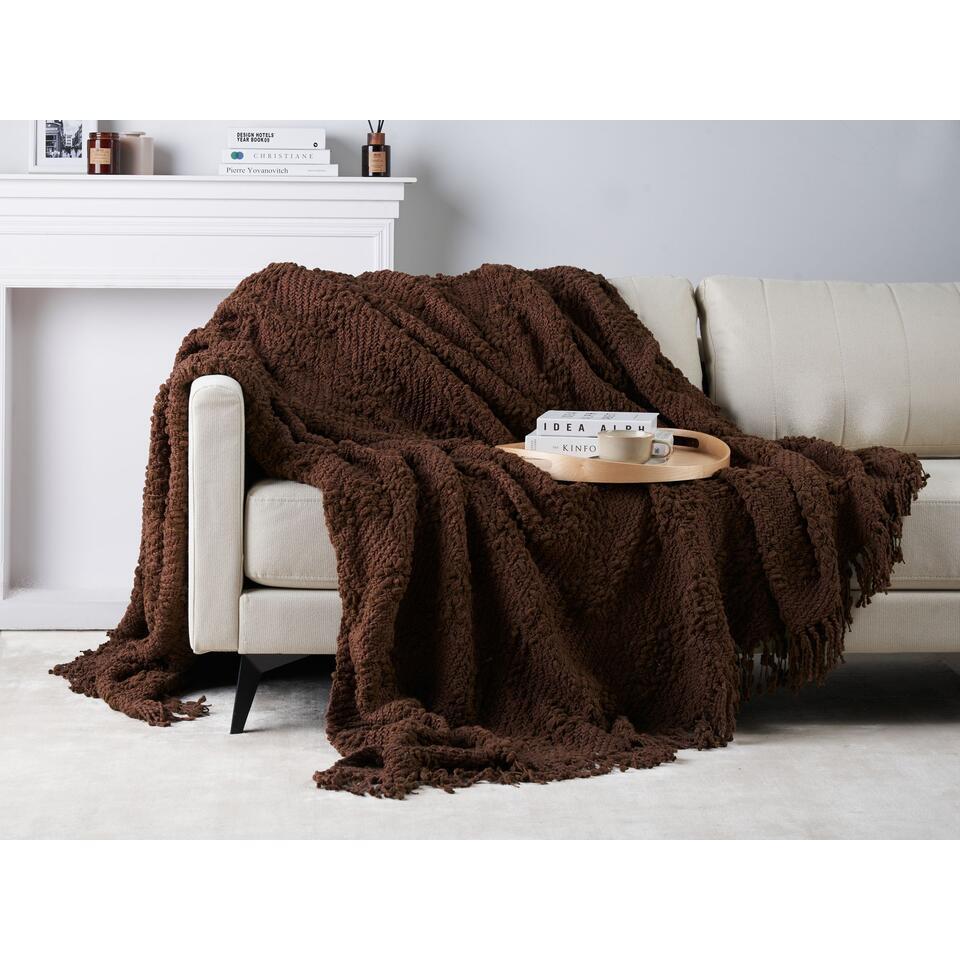 Geweven plaid met kwastjes. Deze deken van zacht katoen met acryl is een must-have voor elk knus interieur. De geweven, lusachtige textuur, gecombineerd met speelse kwastjes, geeft het een boho vibe. Of je nu lekker knus op de bank zit of een laagje warmte aan je bed toevoegt, deze deken houdt je het hele seizoen warm en comfortabel.