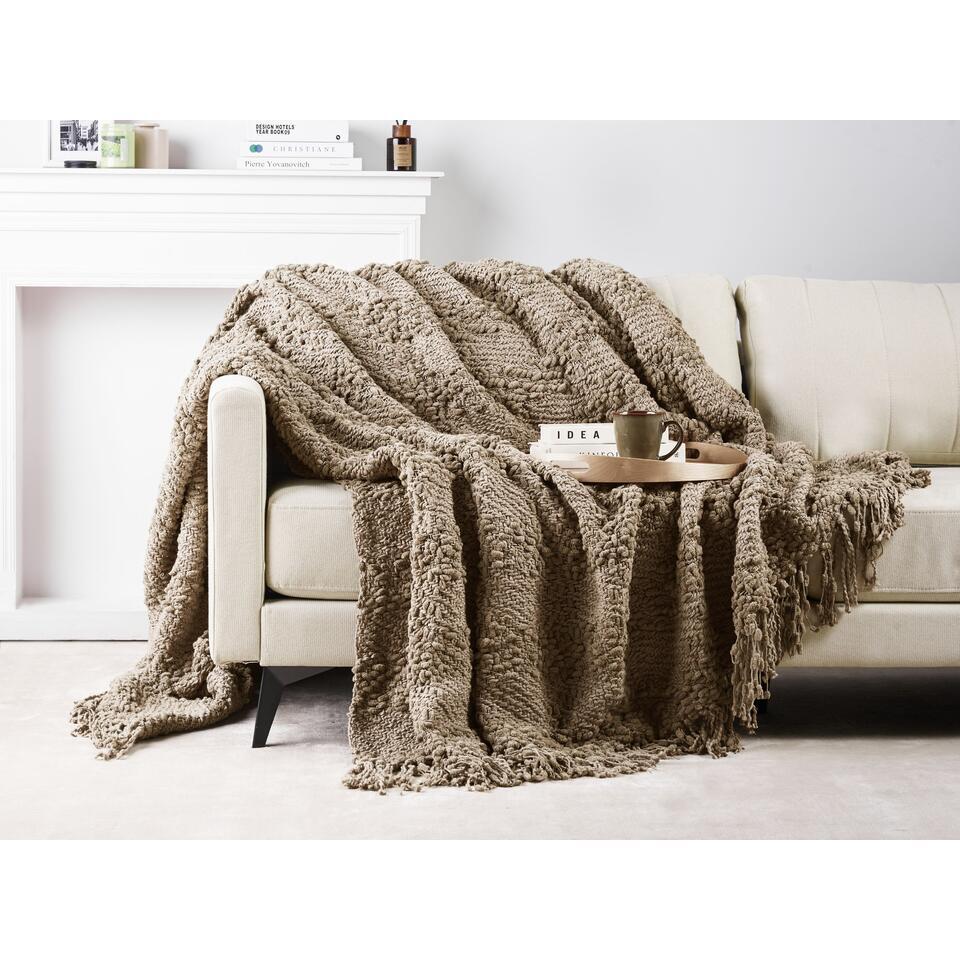 Geweven plaid met kwastjes. Deze deken van zacht katoen met acryl is een must-have voor elk knus interieur. De geweven, lusachtige textuur, gecombineerd met speelse kwastjes, geeft het een boho vibe. Of je nu lekker knus op de bank zit of een laagje warmte aan je bed toevoegt, deze deken houdt je het hele seizoen warm en comfortabel.